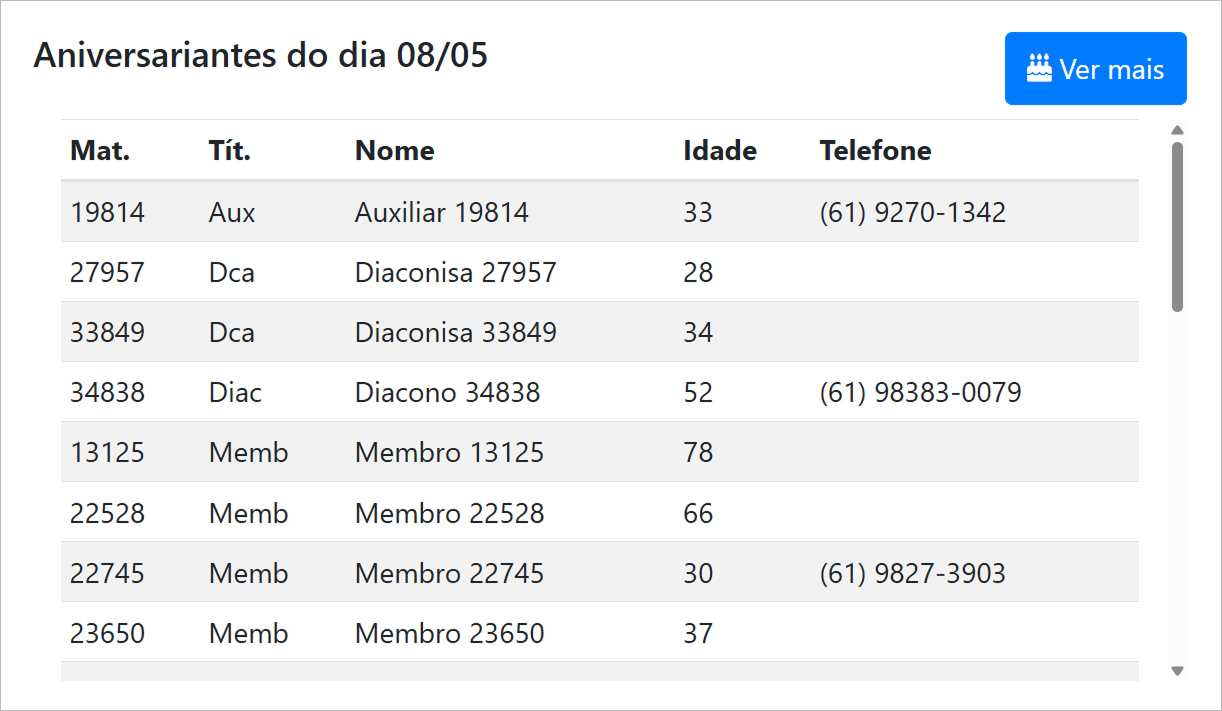 Ao clicar no botão “Ver mais” você será direcionado para a página de aniversariantes.