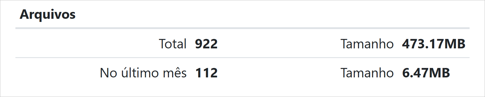 Total de arquivos anexados no sistema (com o tamanho total dos arquivos); Total de arquivos anexados no último mês (com o tamanho total dos arquivos).
