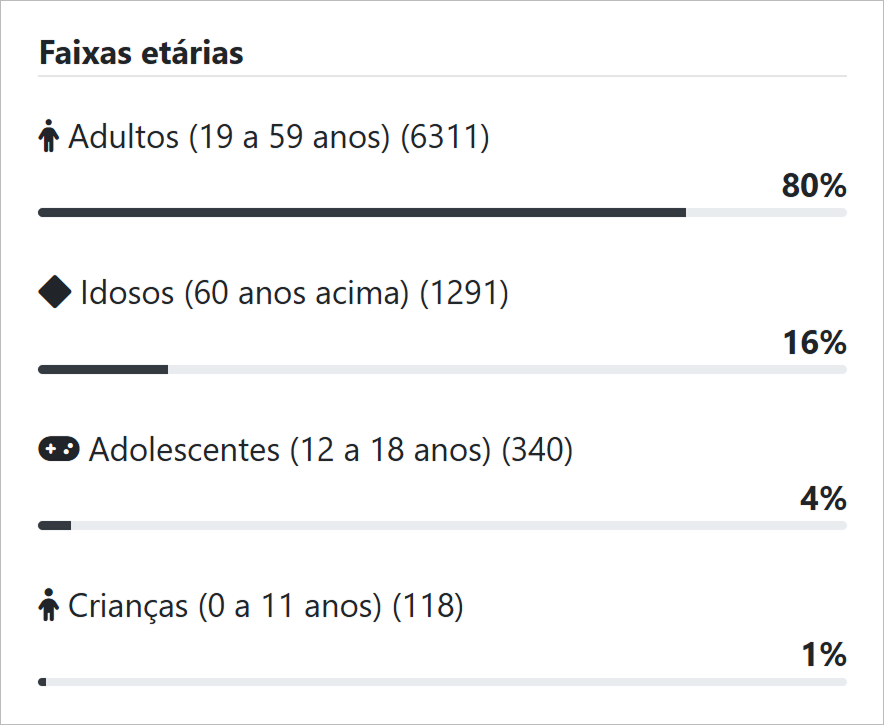 - Faixa etária: crianças, adolescentes, adultos e idosos;