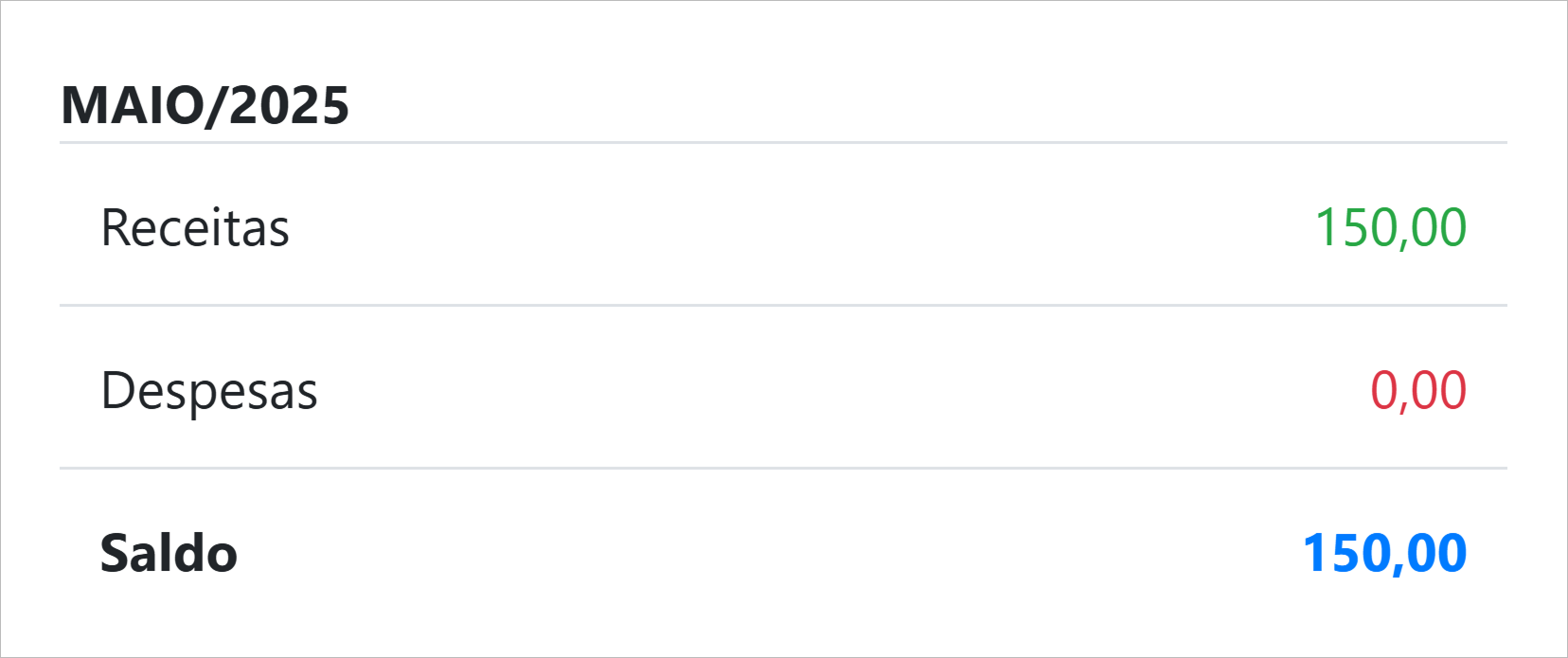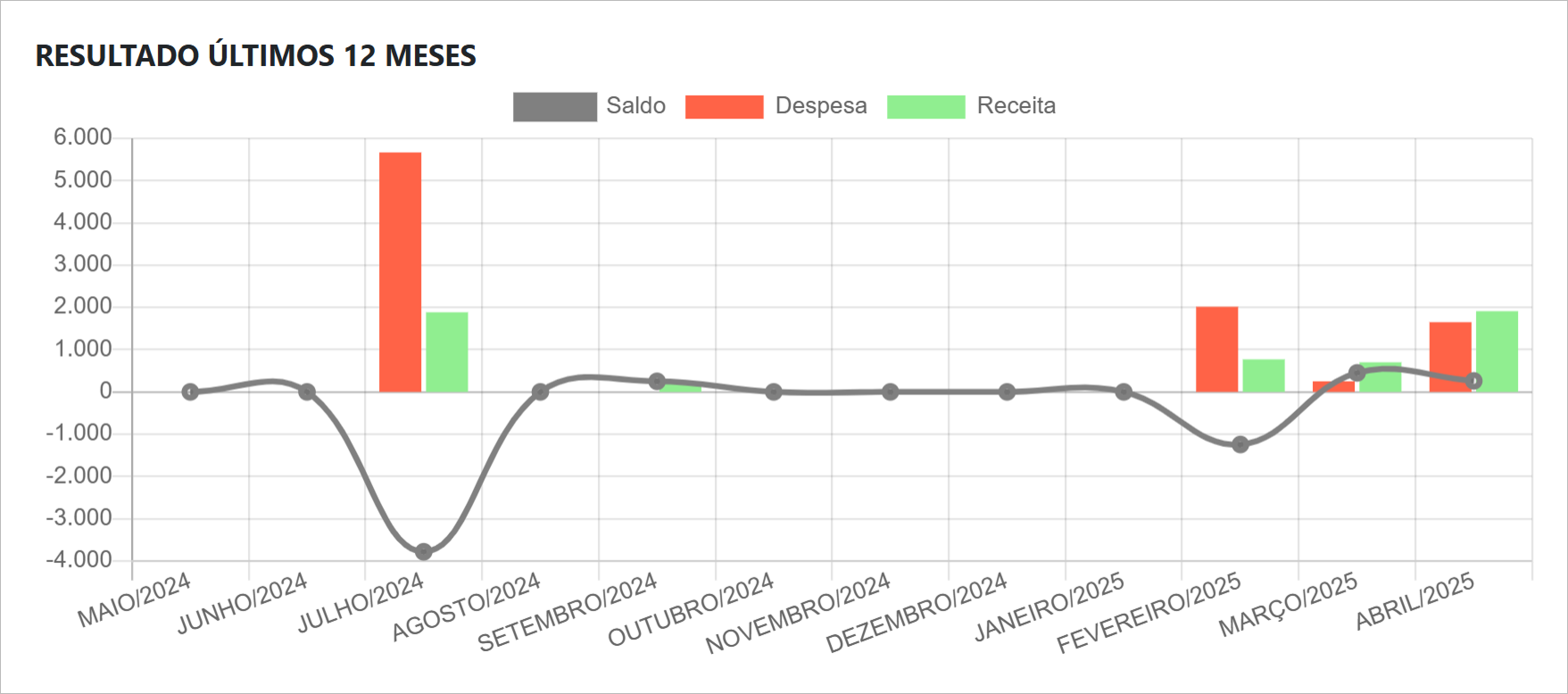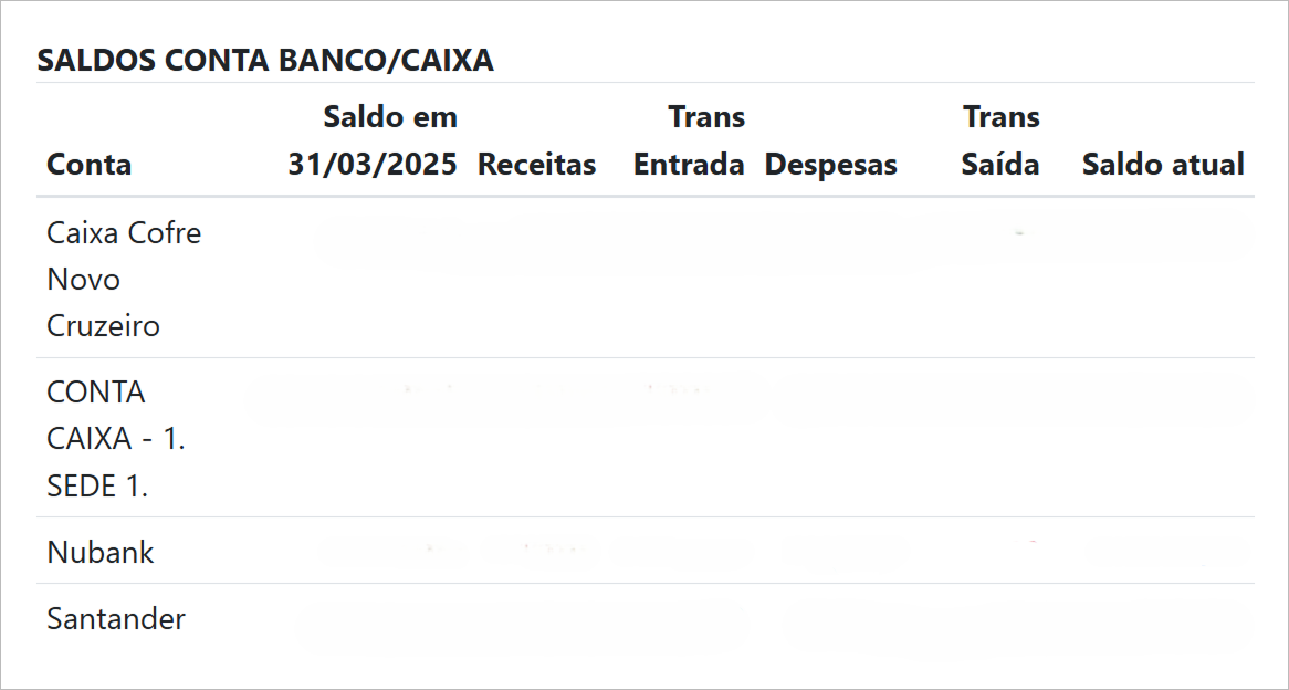 Tabela com as informações financeiras das contas, incluindo: nome do banco/caixa, saldo do mês anterior, receitas (entradas), despesas (saídas) e saldo atual.