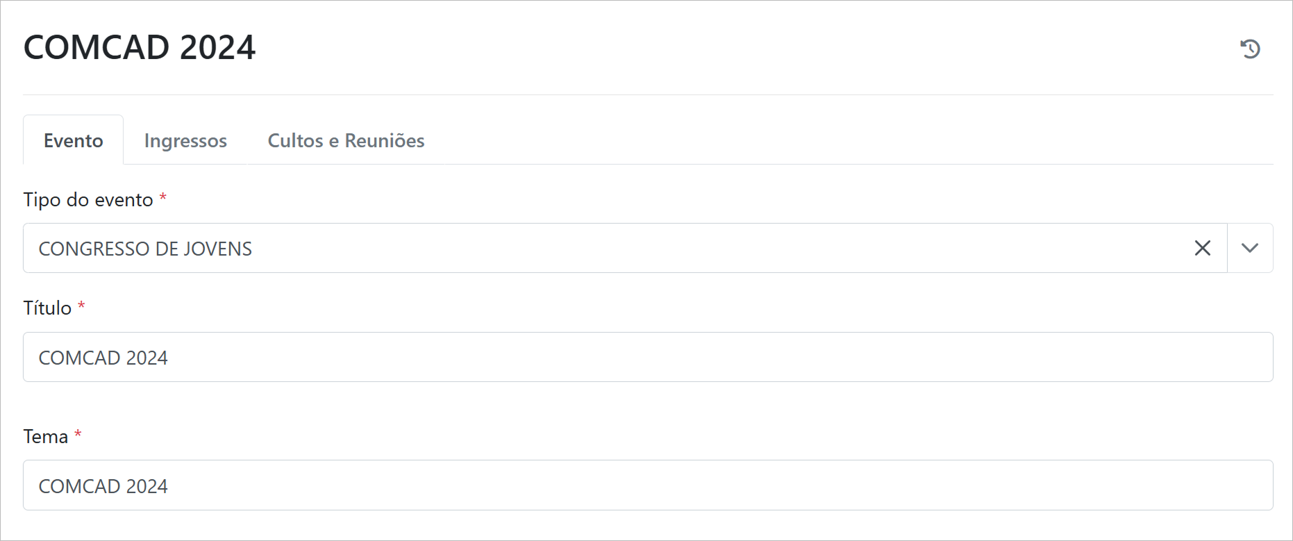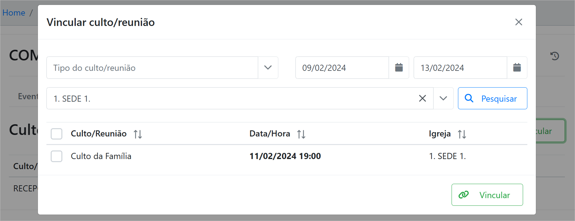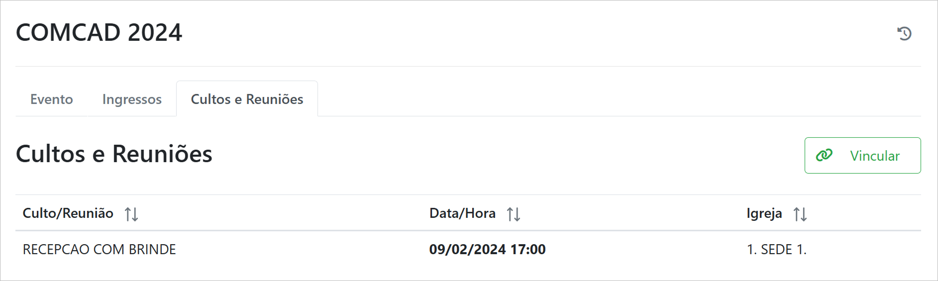 É possível visualizar eventos vinculados a um culto ou reunião.