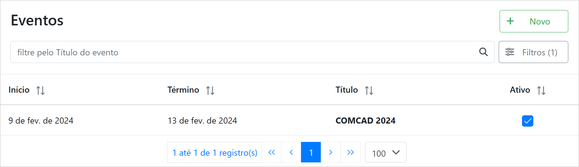 É possível criar novos eventos clicando no botão "Novo".