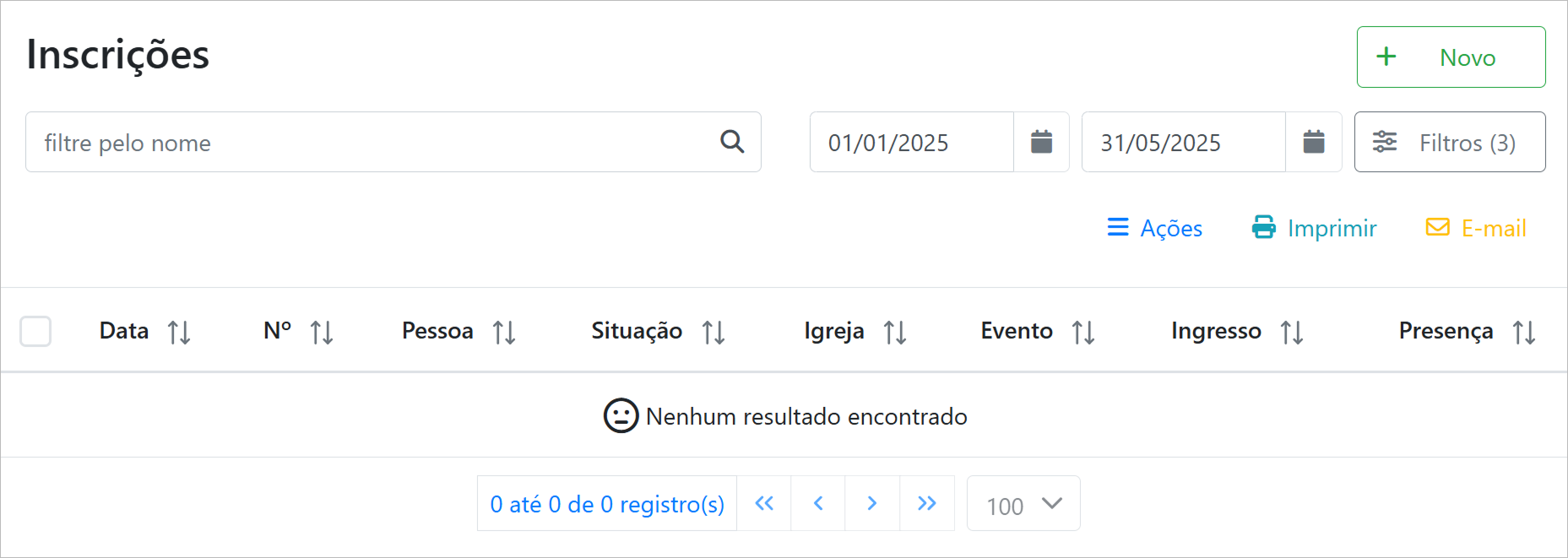 É possível registrar novas inscri ções clicando no botão "Novo".