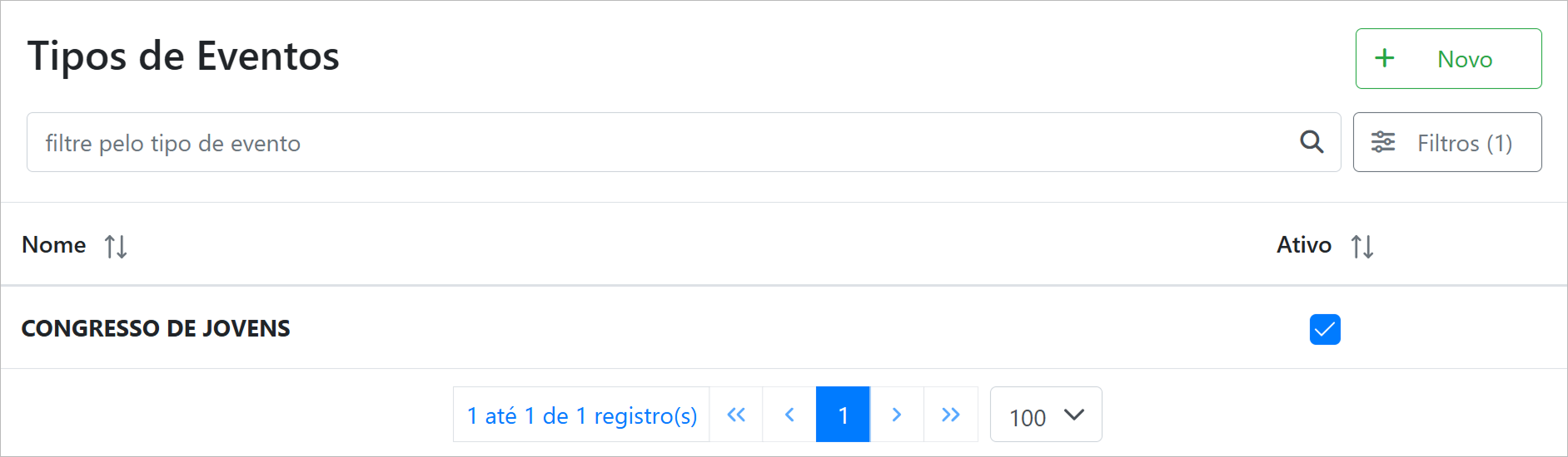 É possível adicionar novos tipos de evento clicando no botão "Novo".