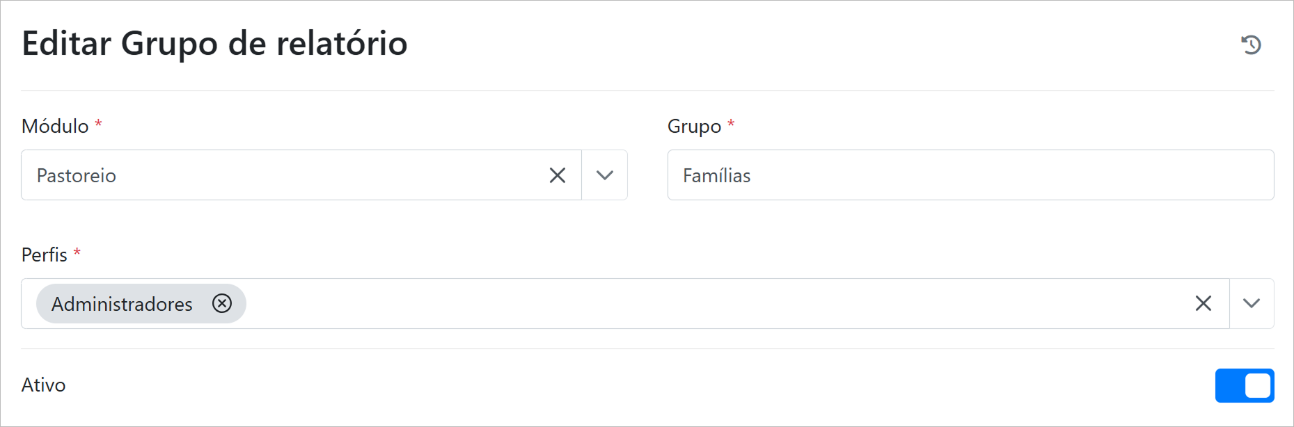 Para editar um grupo de relatórios, clique sobre o registro na tabela.