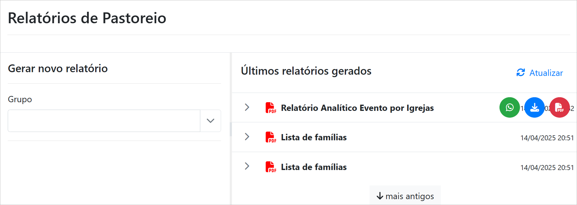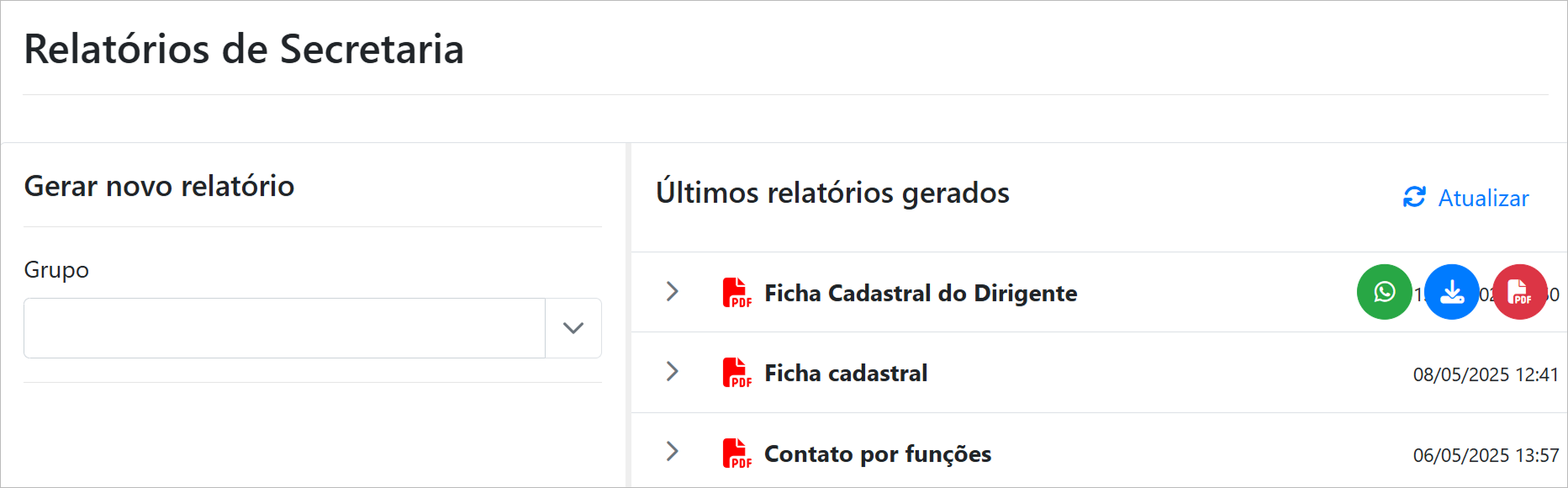 Passando o mouse sobre o relatório desejado é possível ver os ícones de "enviar relatório pelo WhatsApp", "baixar relatório" e "visualizar relatório em PDF".