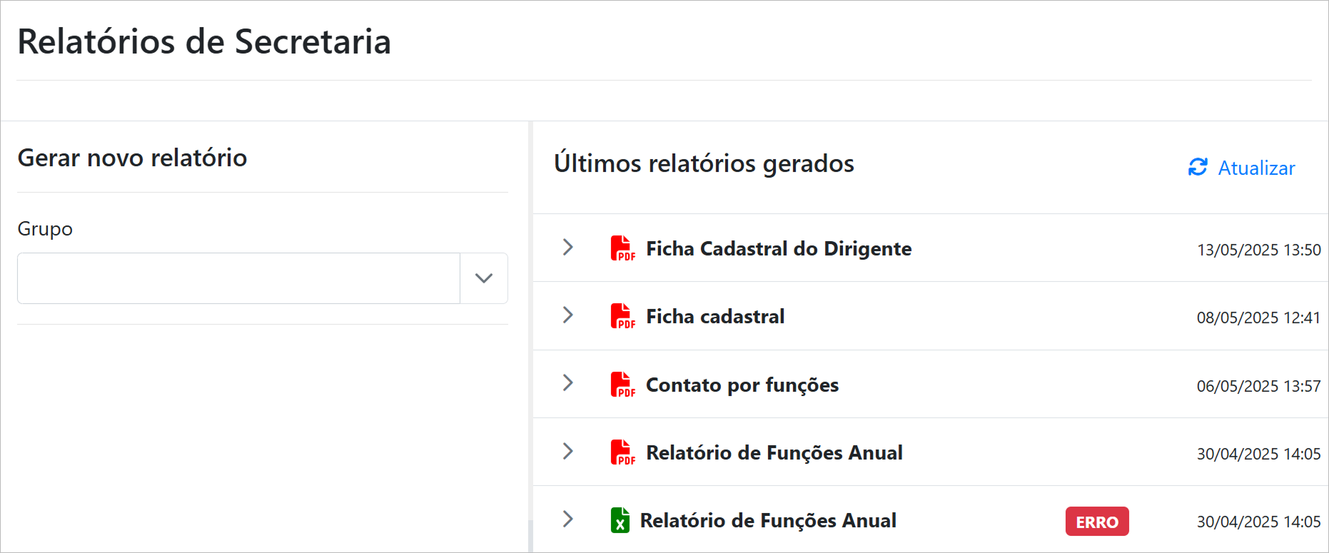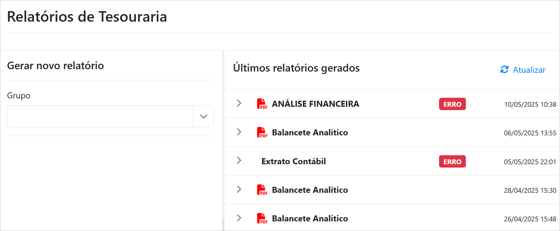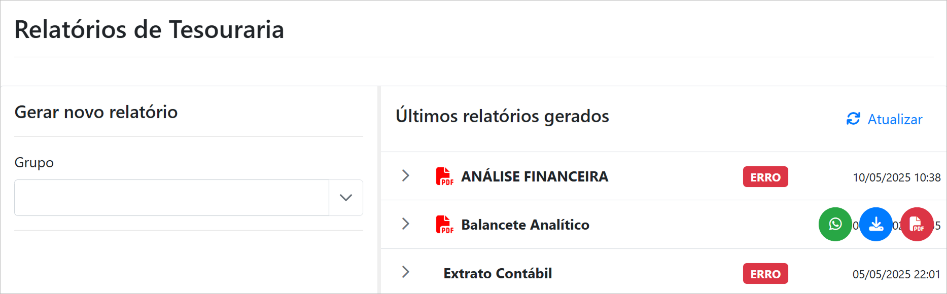 Utilize os filtros para refinar a pesquisa por Grupo e Nome do Relatório.
