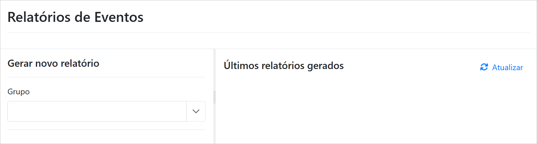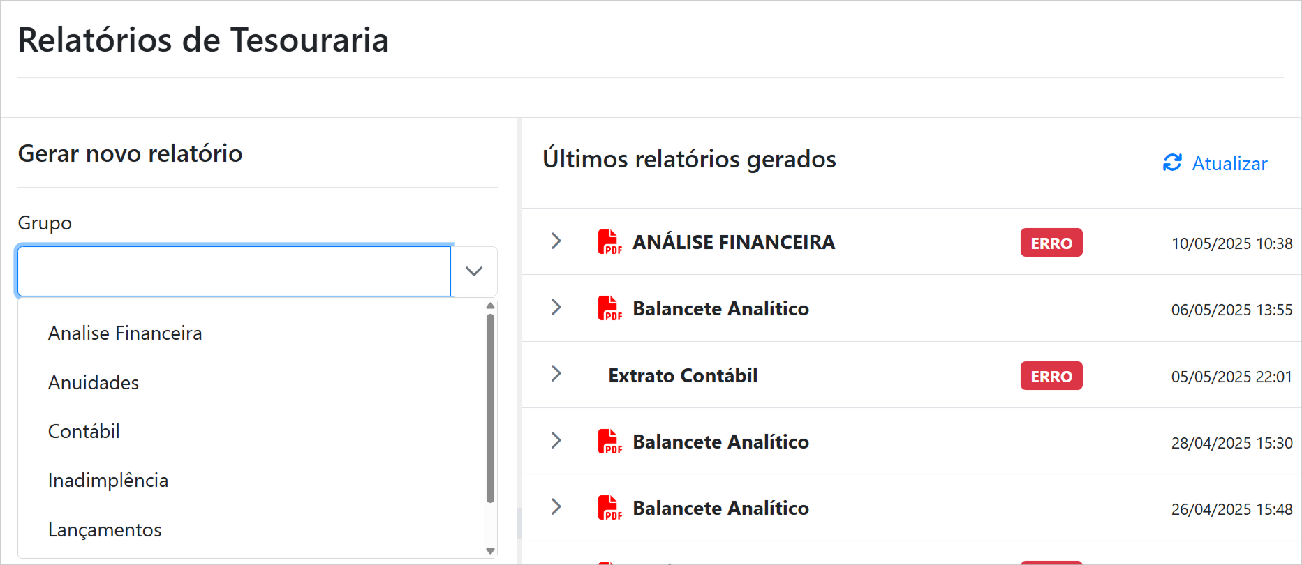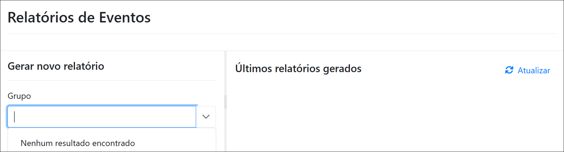 Utilize os filtros para refinar a pesquisa por Grupo e Nome do Relatório.