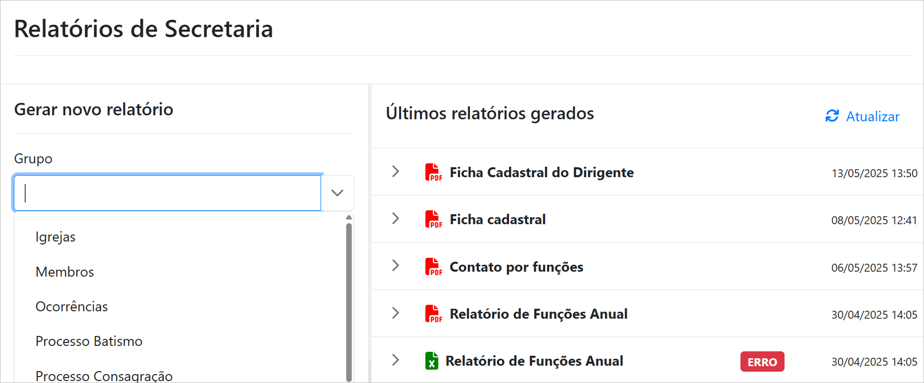 Página que exibe todos os relatórios relacionados à secretaria da igreja.