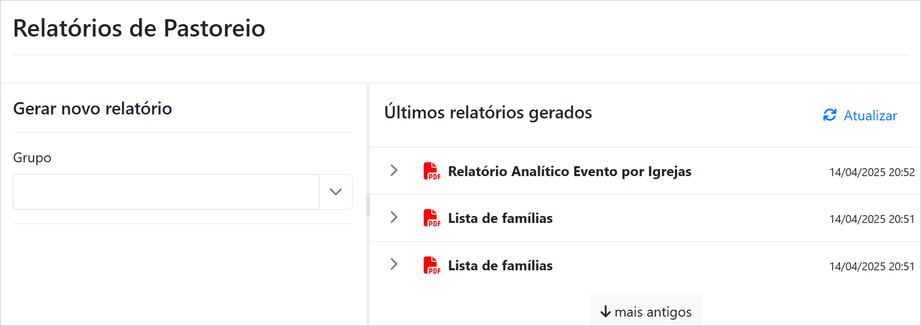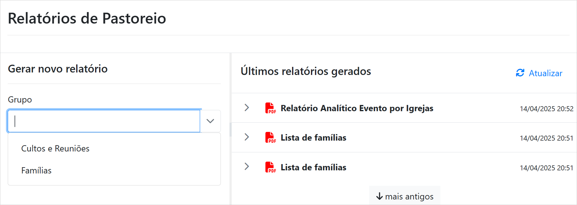 Página com relatórios de acompanhamento pastoral, como famílias, cultos, visitantes, entre outros.