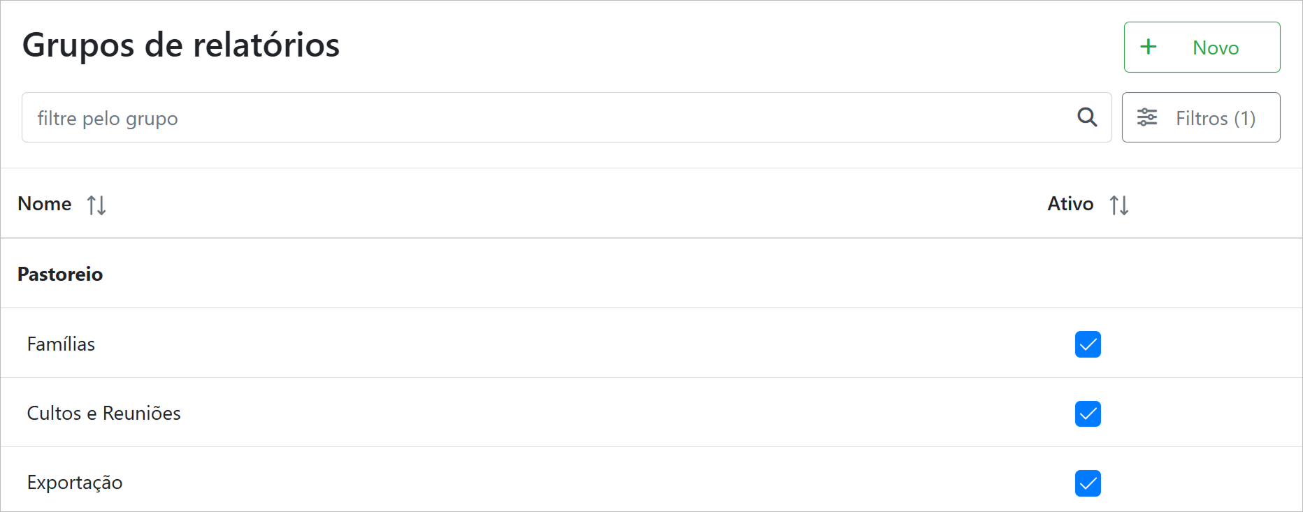 Também é possível filtrar os relatórios por "Grupo" e "Nome".