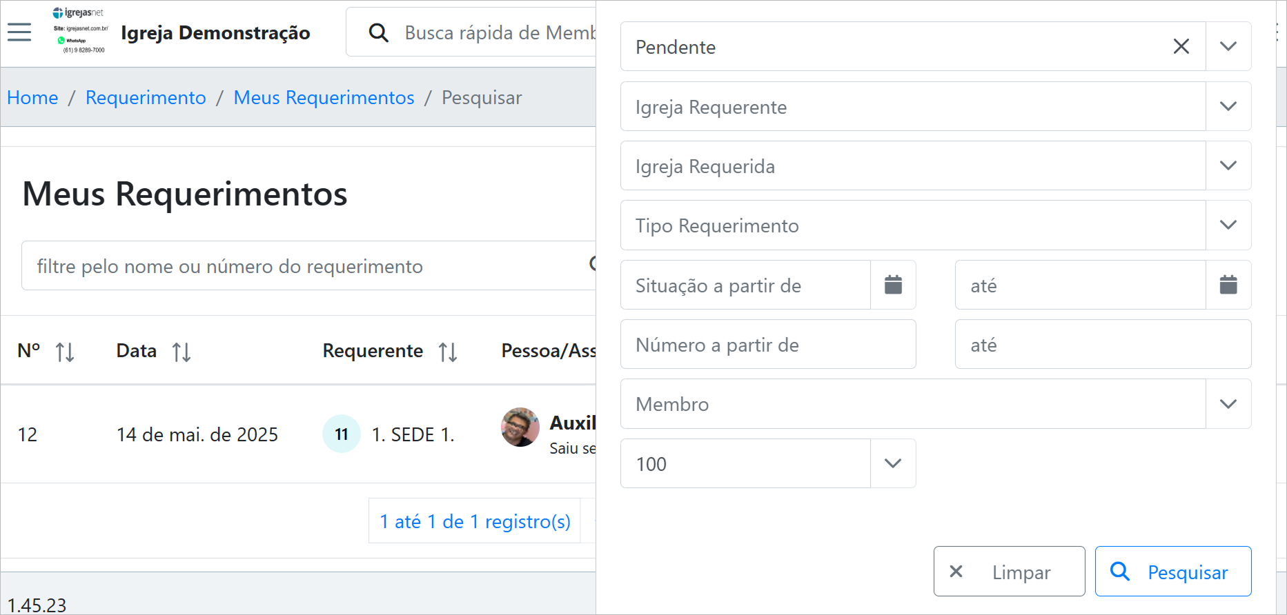 Página que exibe todos os requerimentos enviados pela sua igreja.