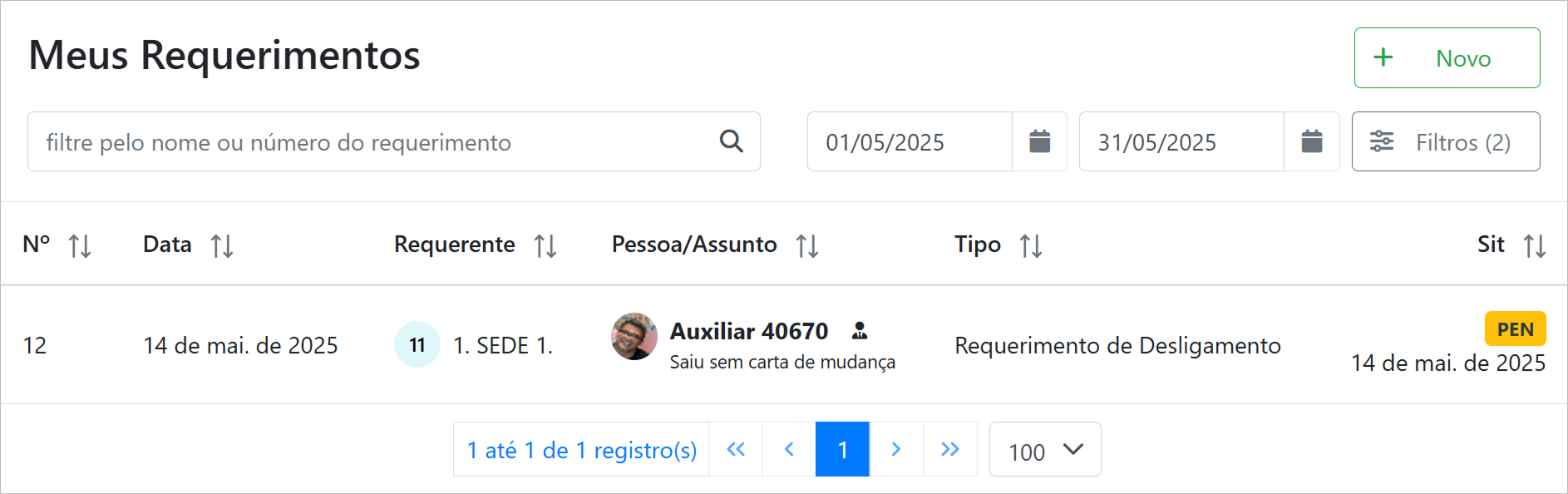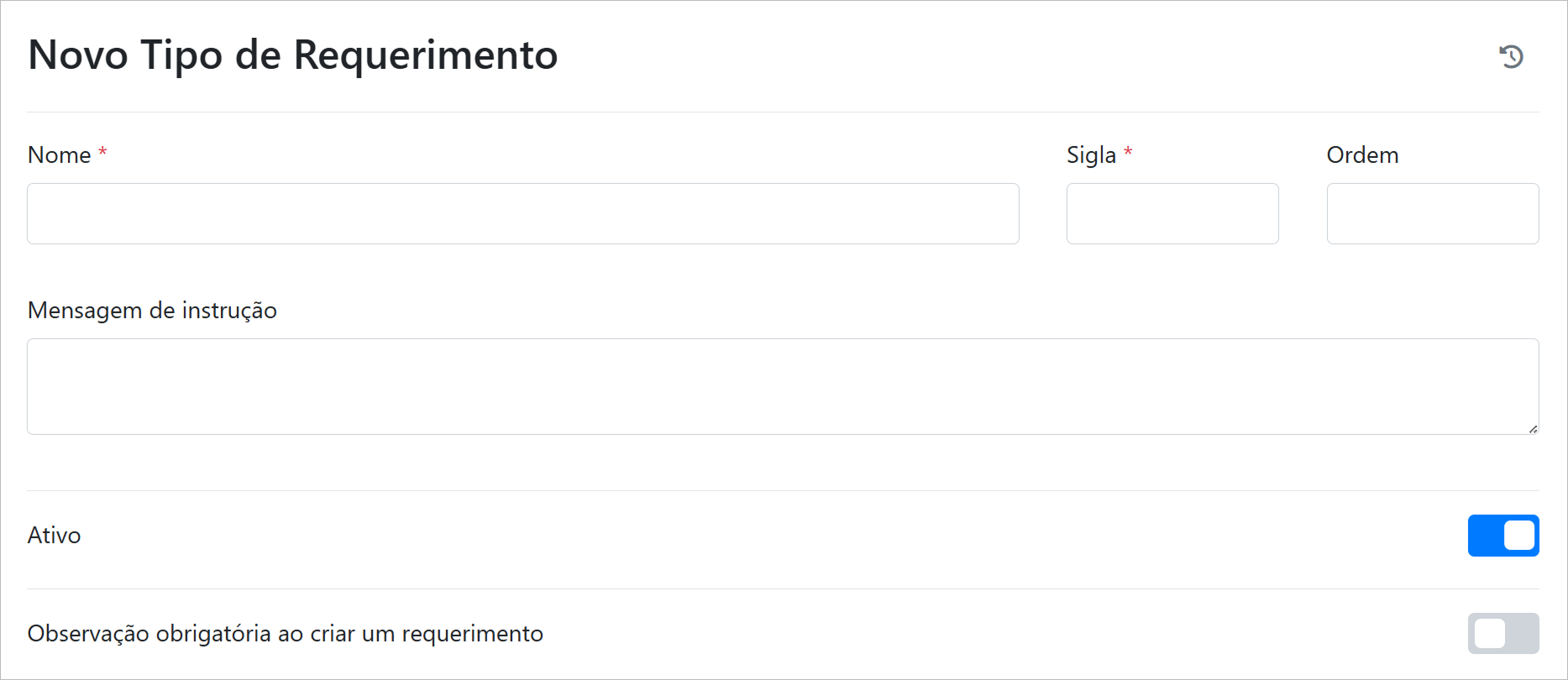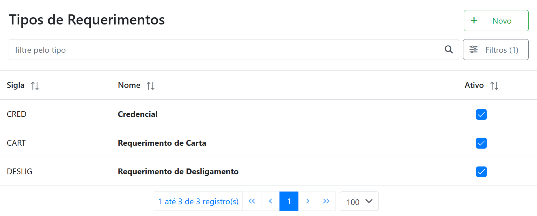 Para adicionar um novo tipo de requerimento, clique em "Novo".