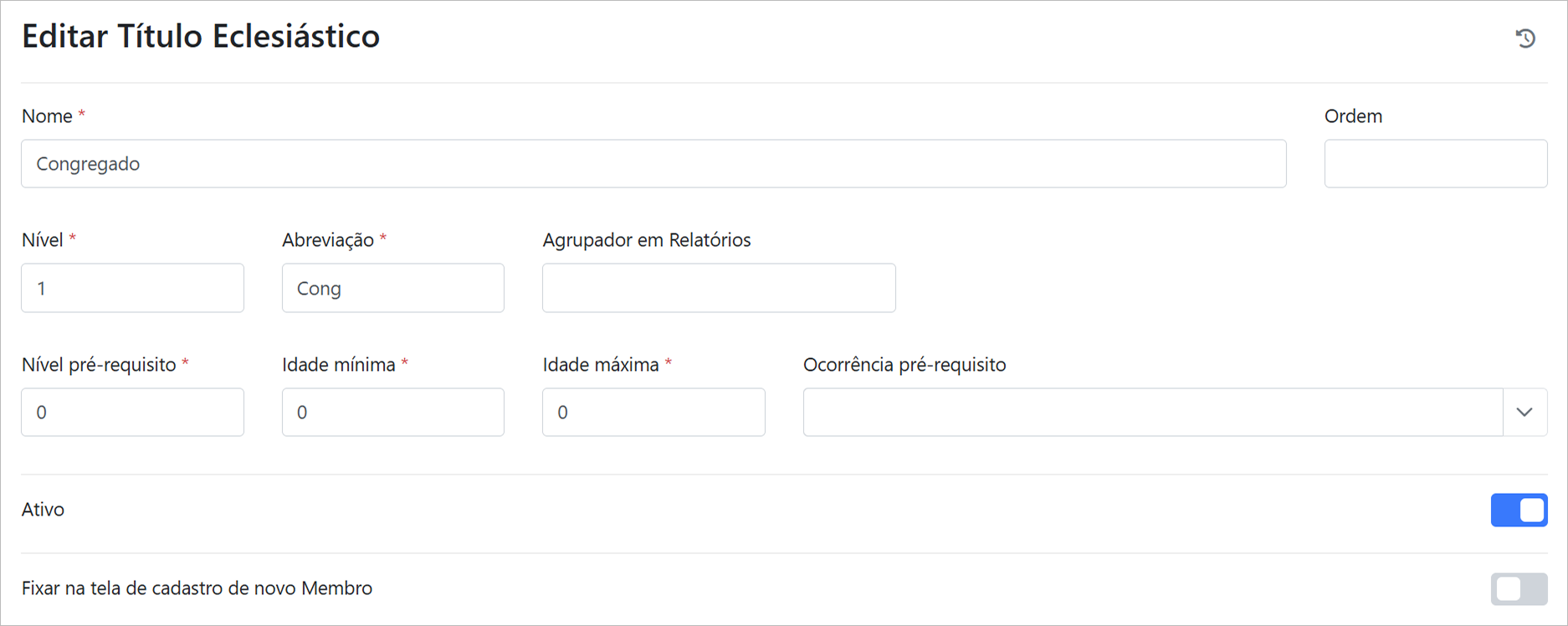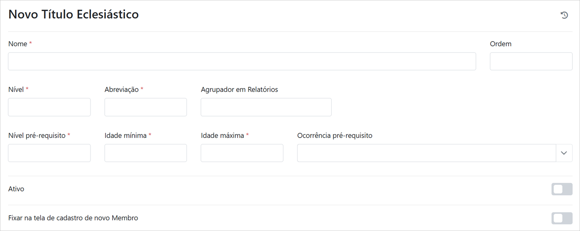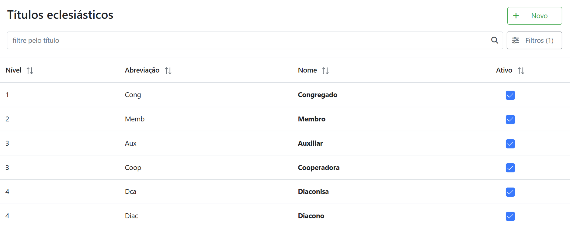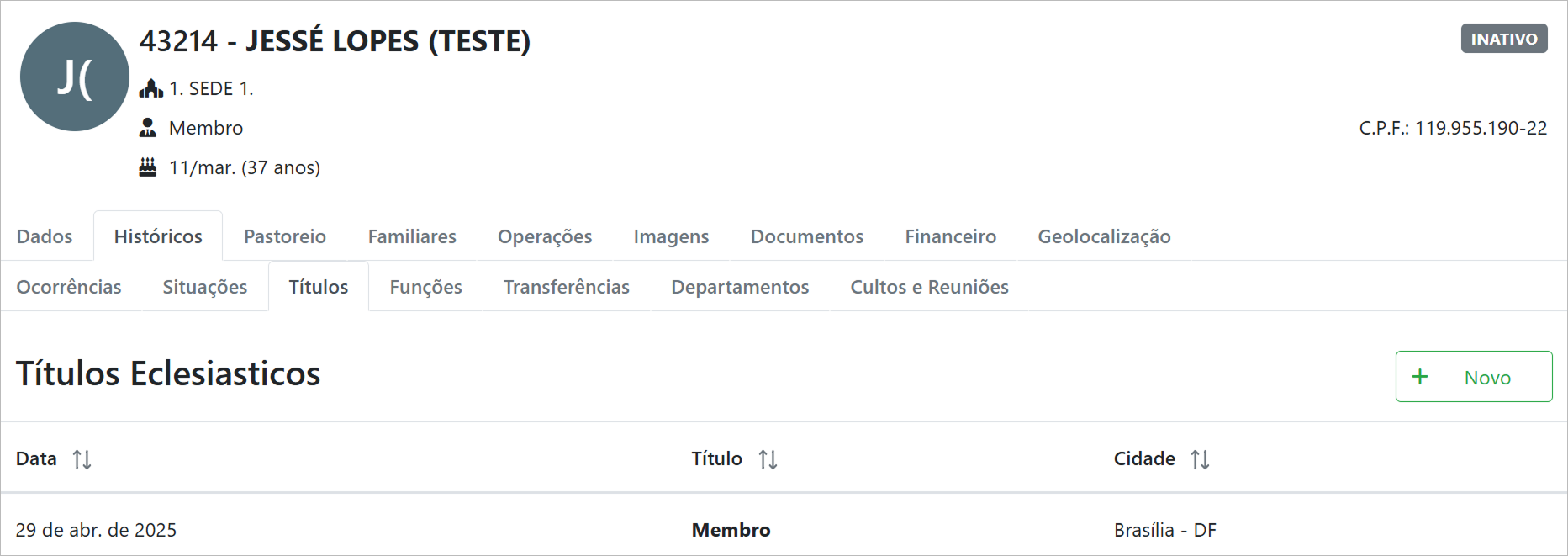 Lista os títulos eclesiásticos recebidos pelo membro (ex: Diácono, Presbítero, Pastor). É possível adicionar novos títulos à medida que o membro for sendo consagrado, clicando no botão "+ Novo".