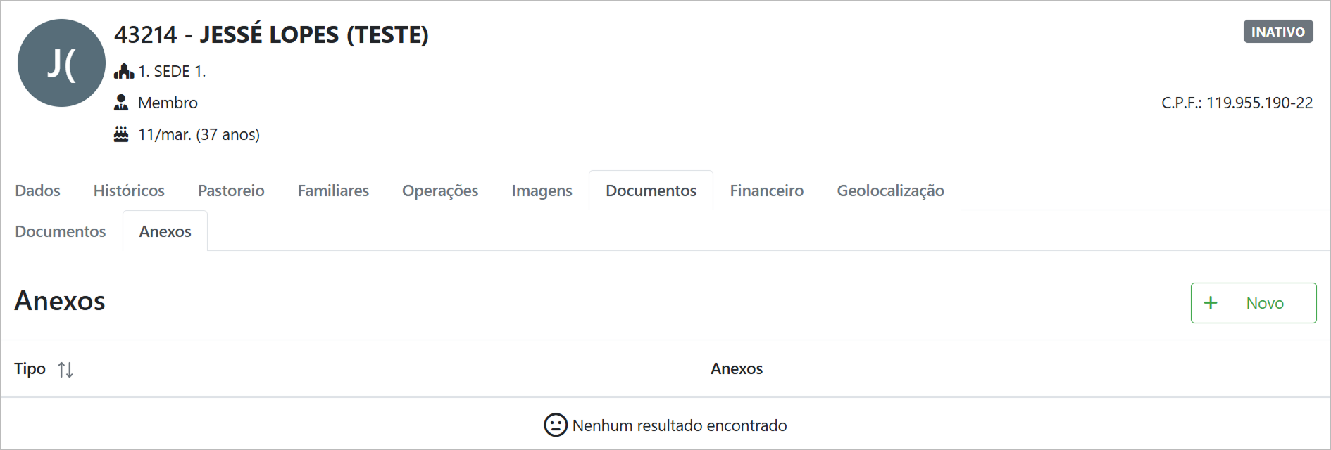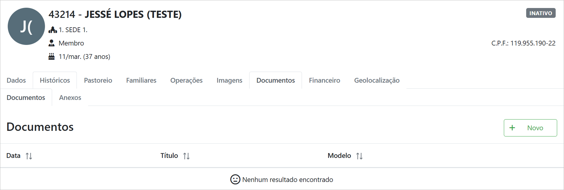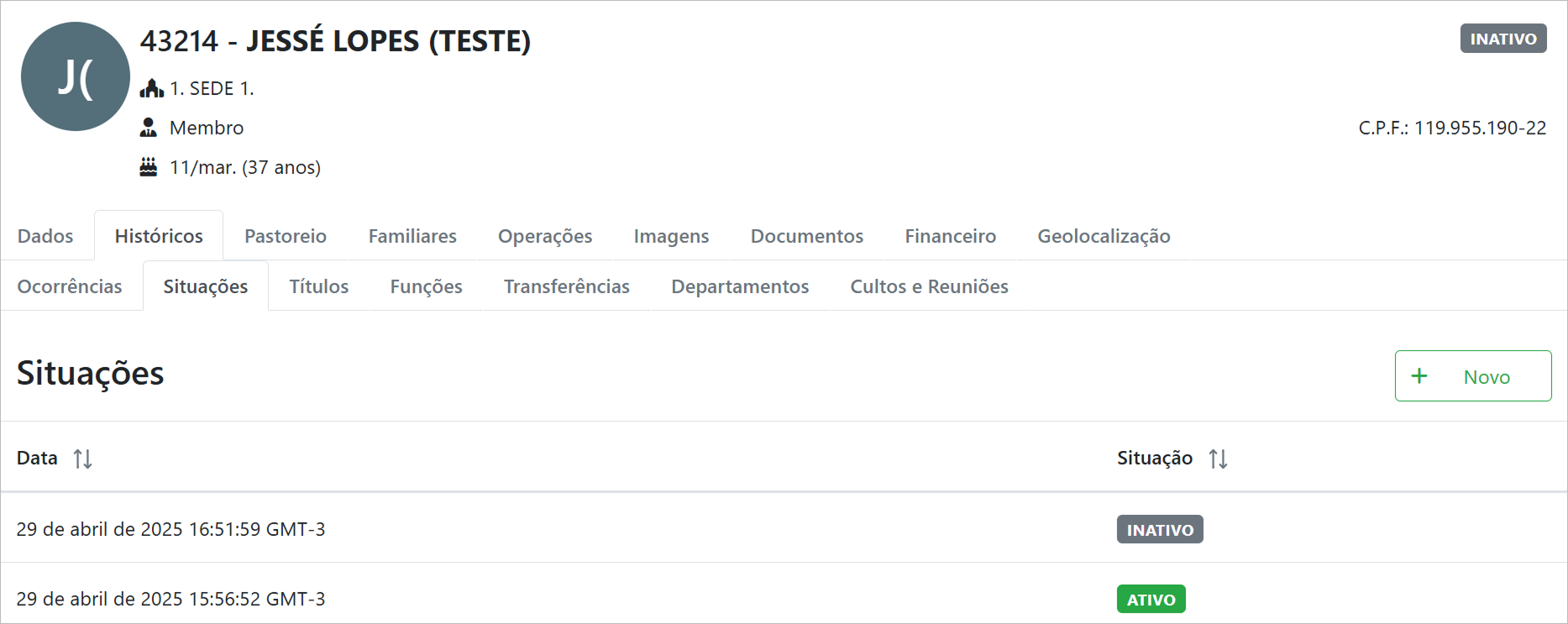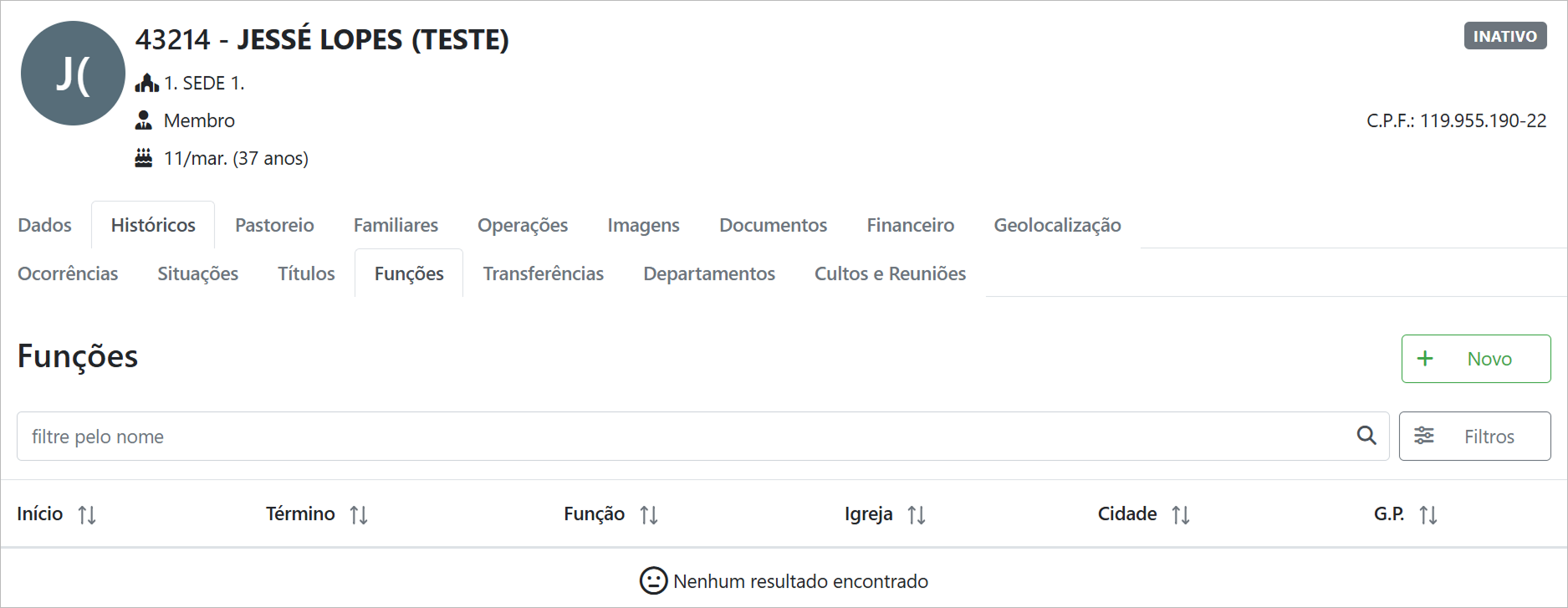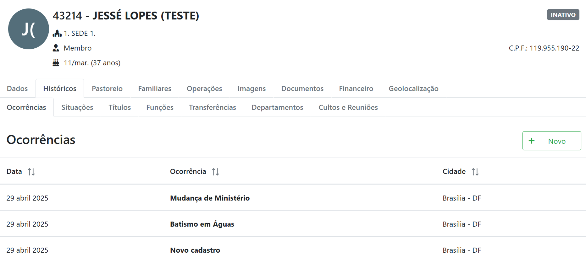 Lista os títulos eclesiásticos recebidos pelo membro (ex: Diácono, Presbítero, Pastor). É possível adicionar novos títulos à medida que o membro for sendo consagrado, clicando no botão "+ Novo".