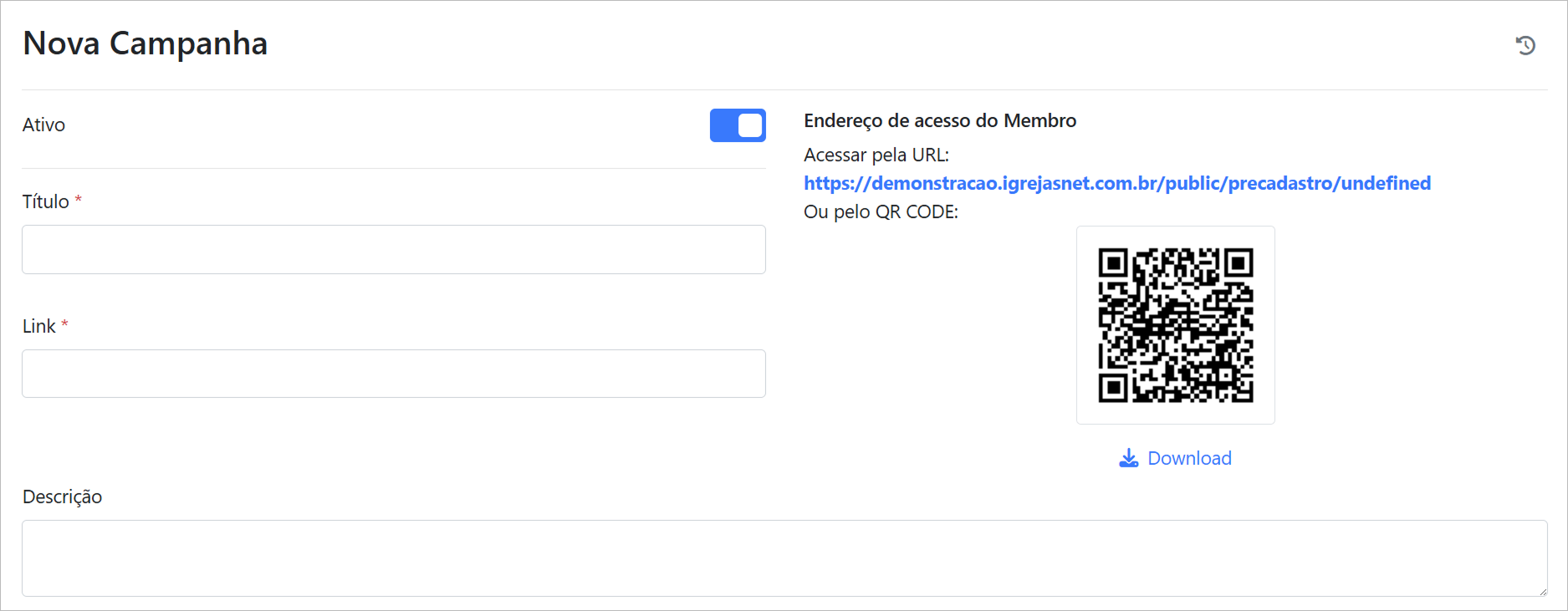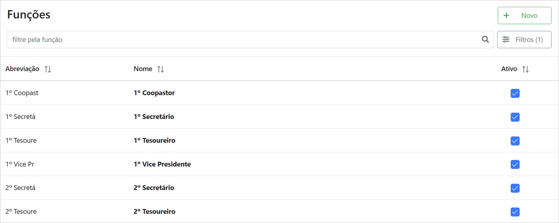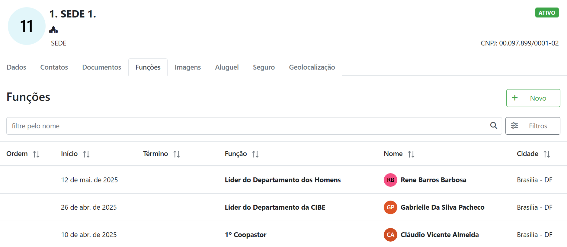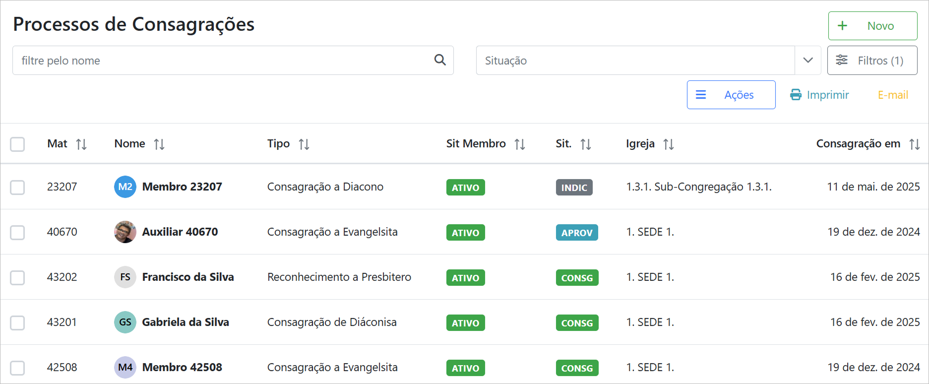 Lista os títulos eclesiásticos recebidos pelo membro (ex: Diácono, Presbítero, Pastor). É possível adicionar novos títulos à medida que o membro for sendo consagrado, clicando no botão "+ Novo".