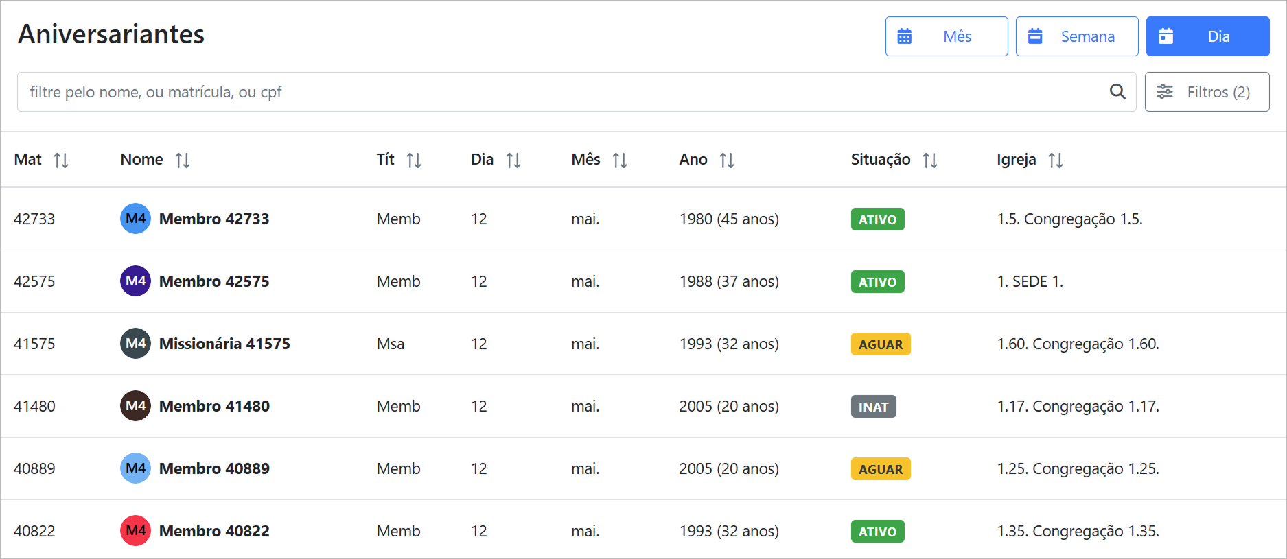 Página que exibe a lista de membros aniversariantes, com base no mês atual.