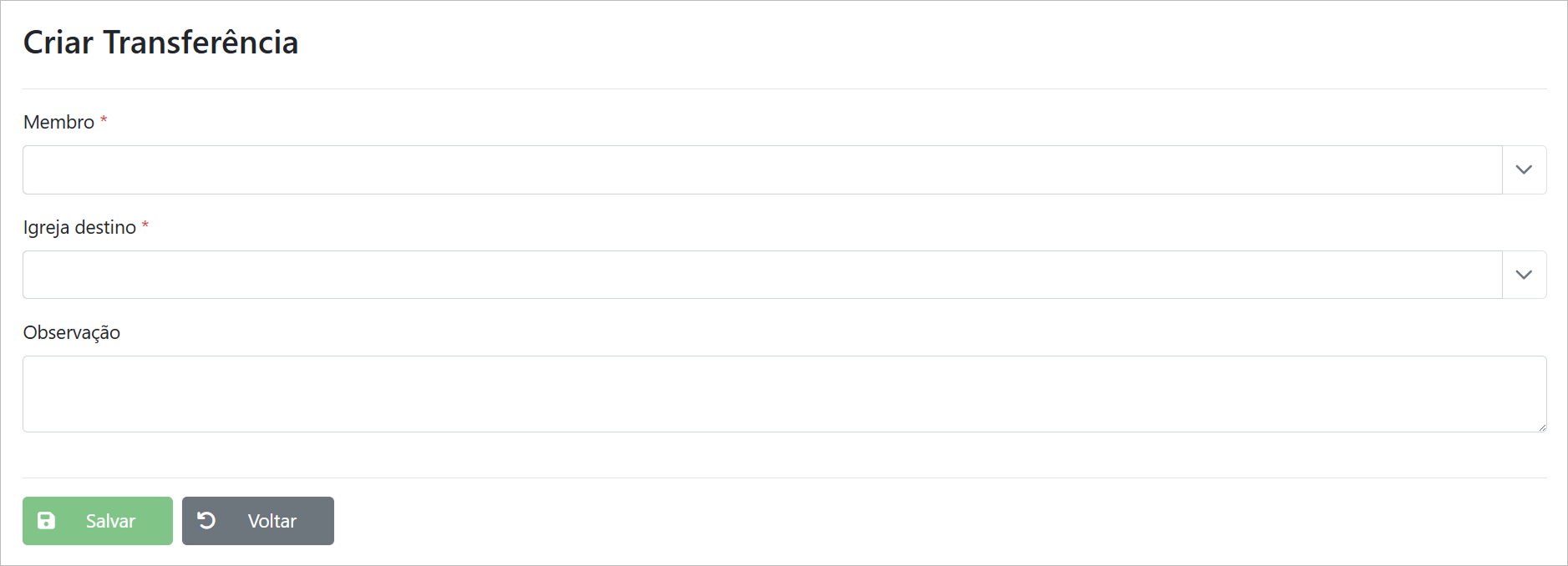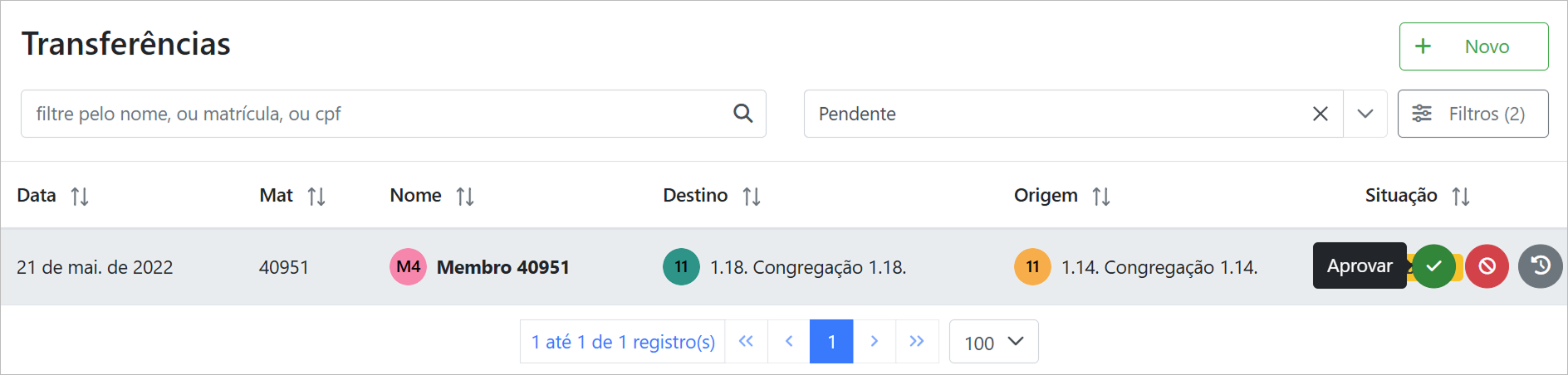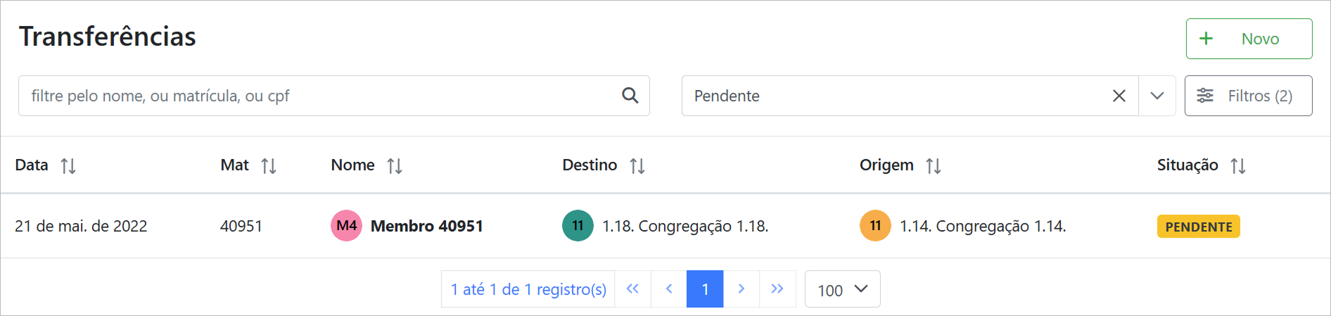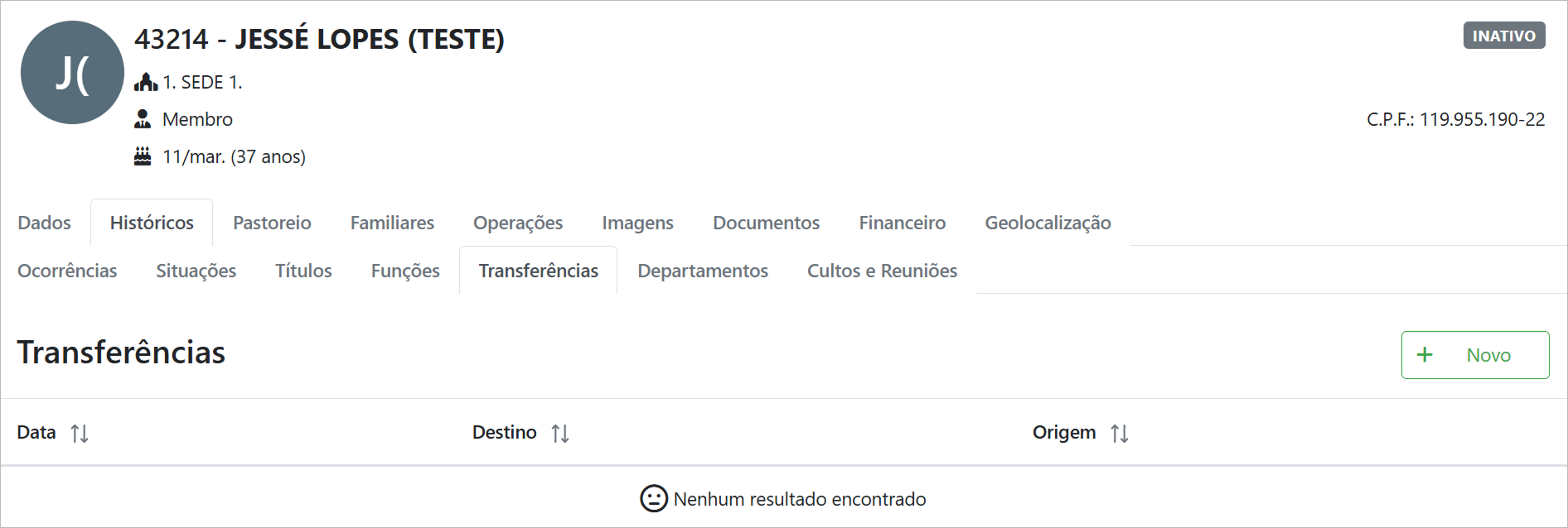 Exibe o histórico de transferências entre igrejas dentro da organização, com registros de datas e destinos.