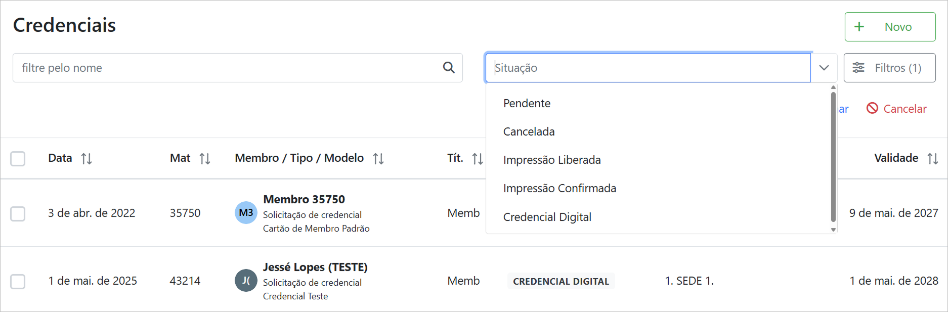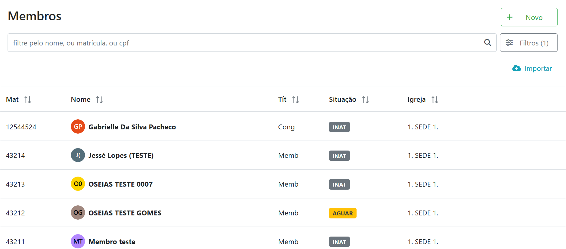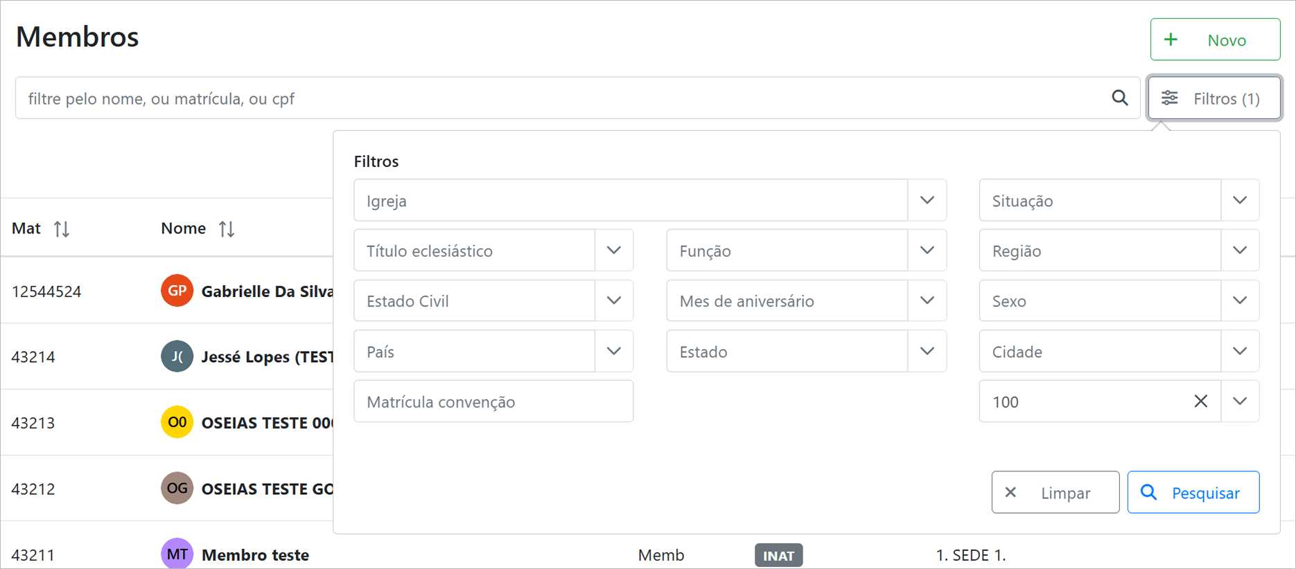 A aba de membros possui um campo de busca que permite localizar registros por nome, matrícula ou CPF.