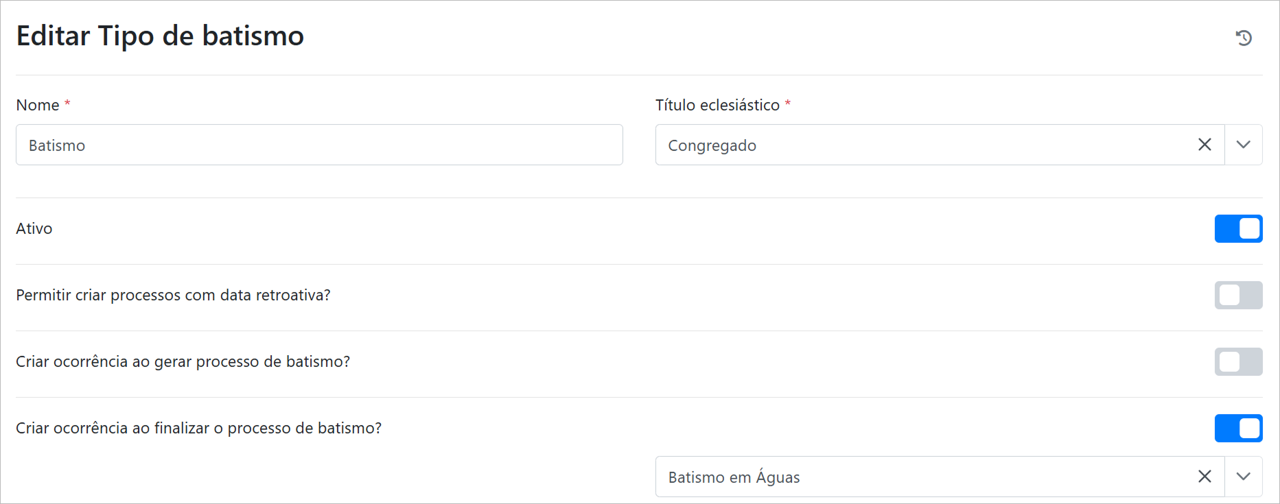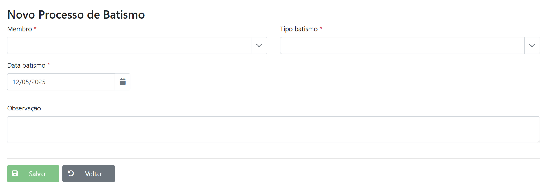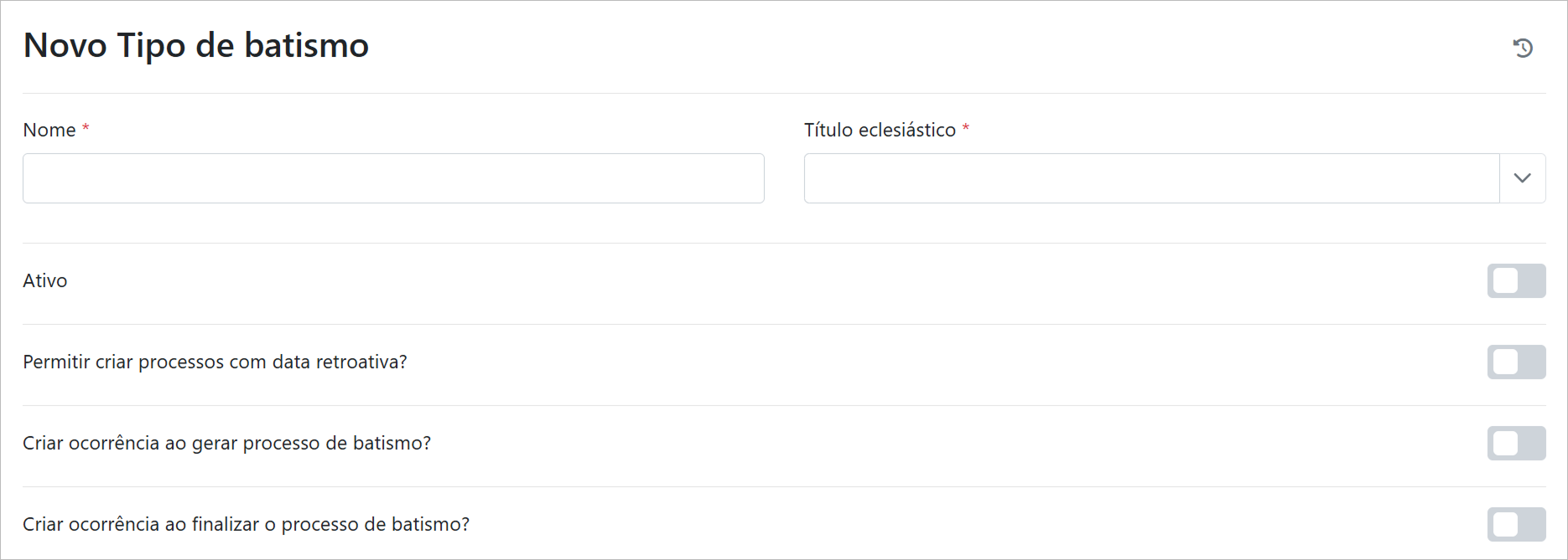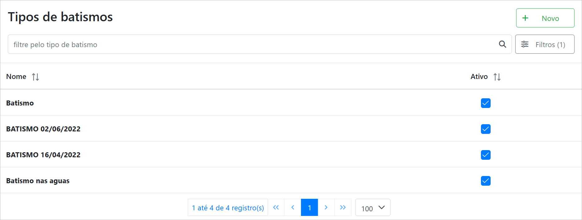 É possível adicionar um novo tipo de batismo, clicando em "+ Novo".
