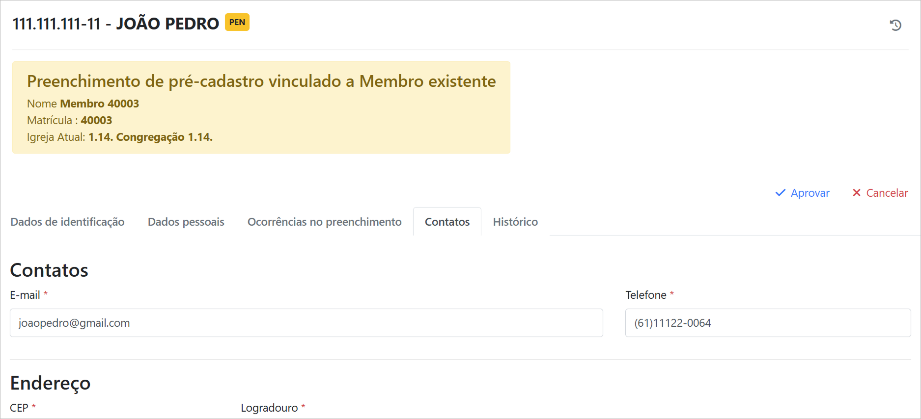 Exibe as informações de contato do membro, como telefone, e-mail e outras formas de comunicação.