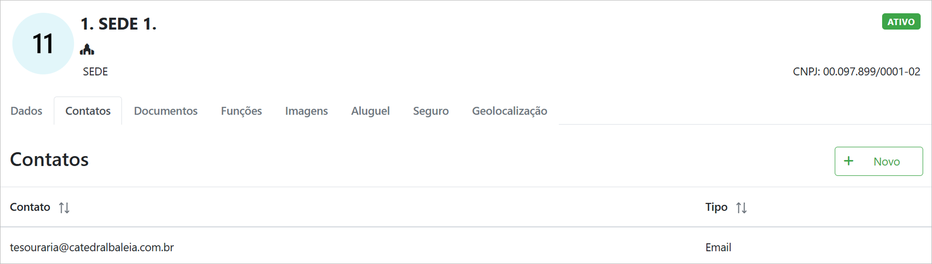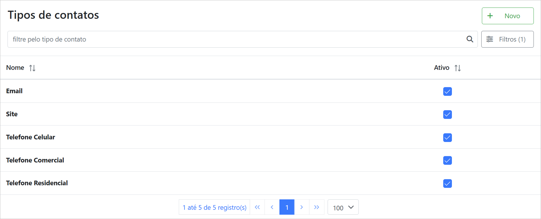 É possível adicionar um novo tipo de contato, clicando em "+ Novo".