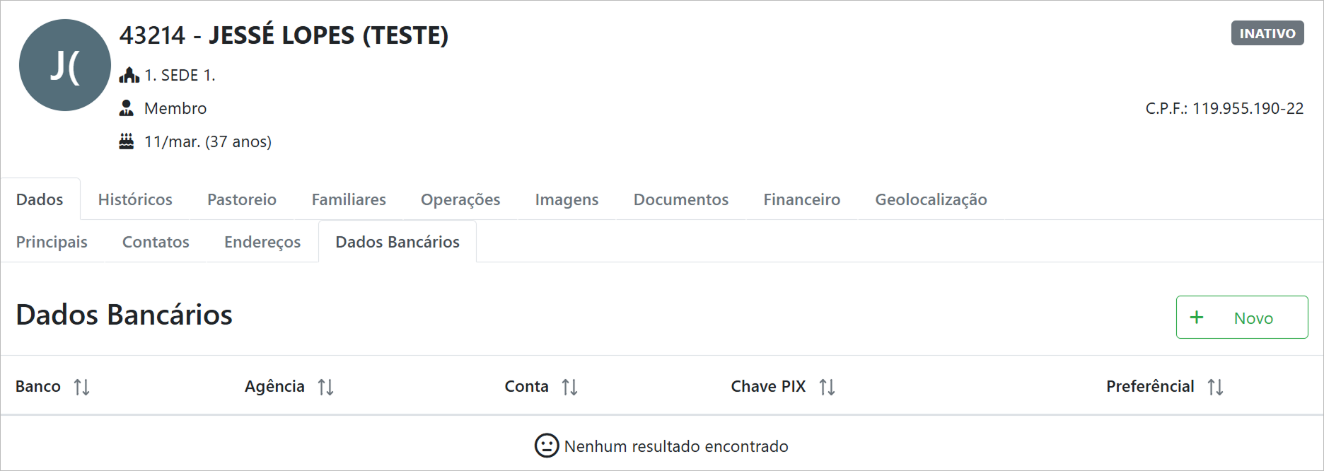 É possível adicionar novos dados bancários clicando no botão "+ Novo".