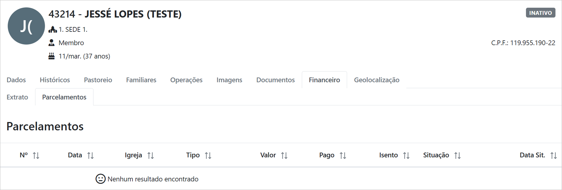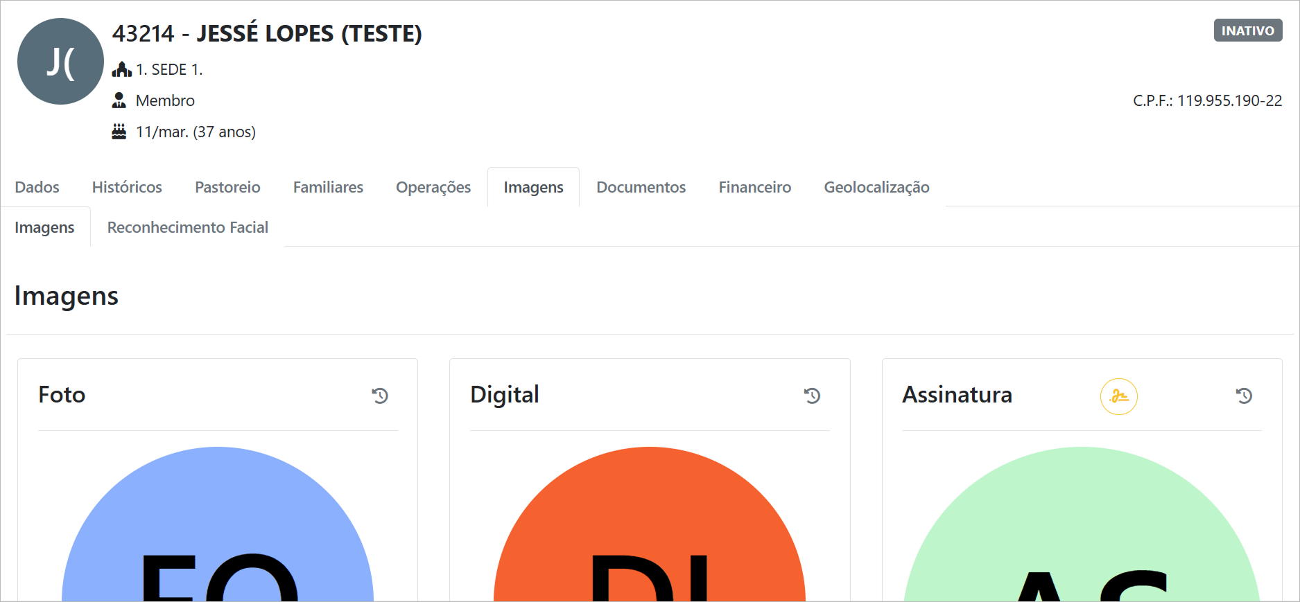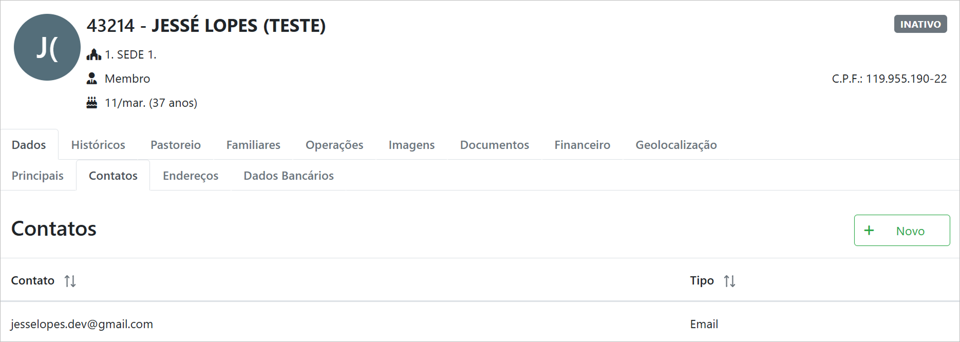 - Histórico de contribuições financeiras, como dízimos e ofertas;