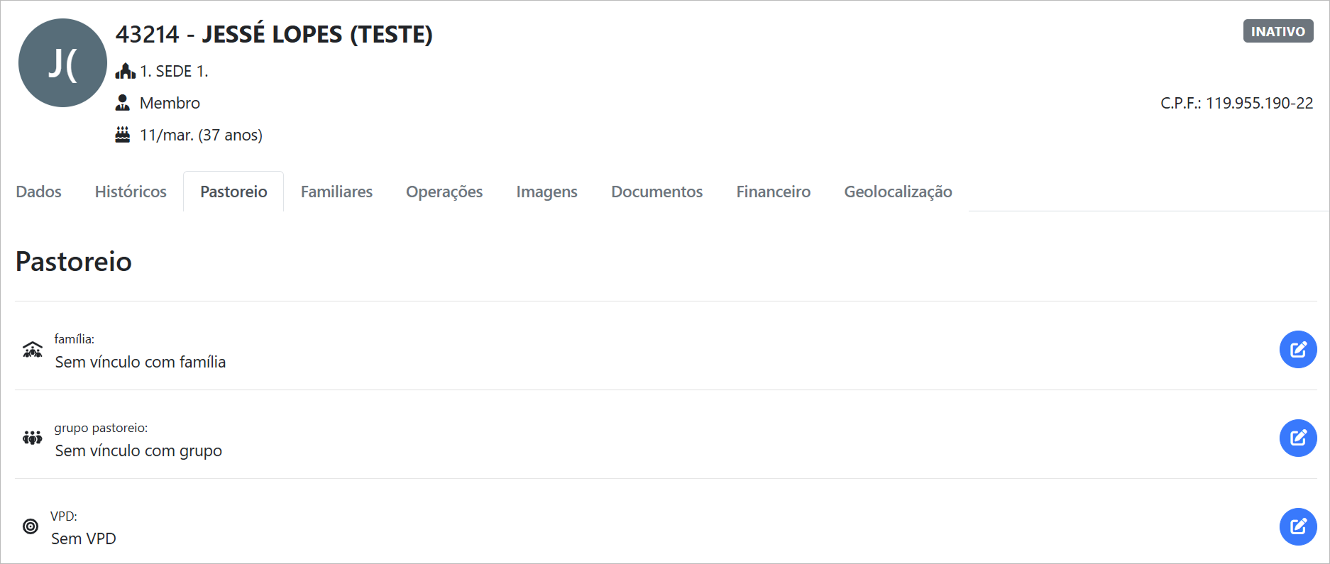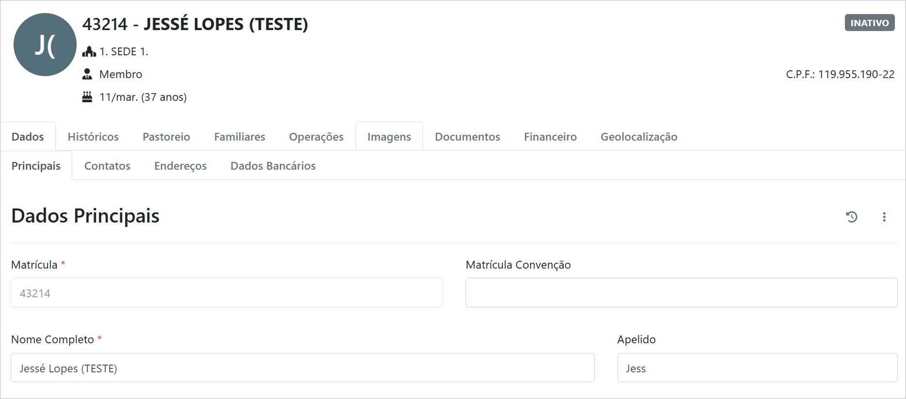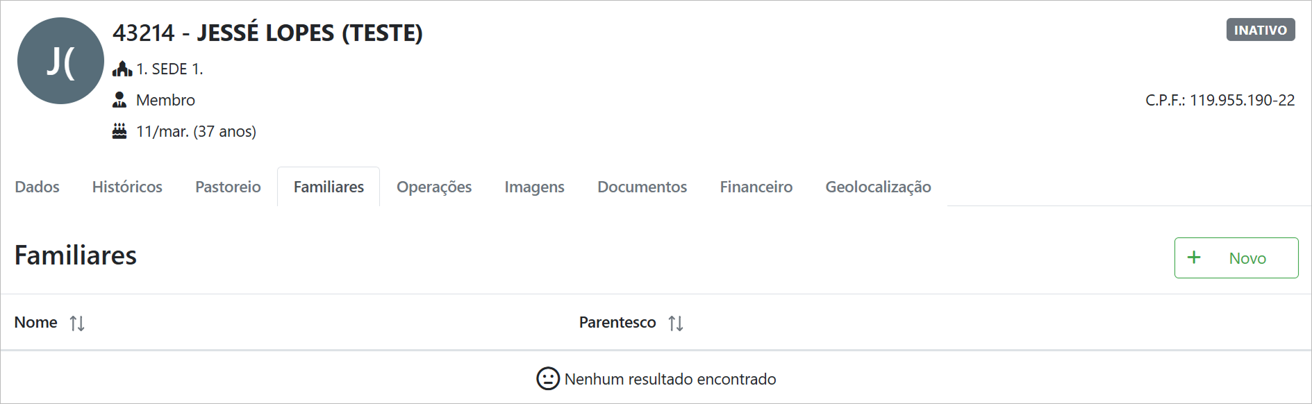 Ao localizar um membro e clicar sobre o nome, será exibida a página de detalhes completos, organizada por seções: