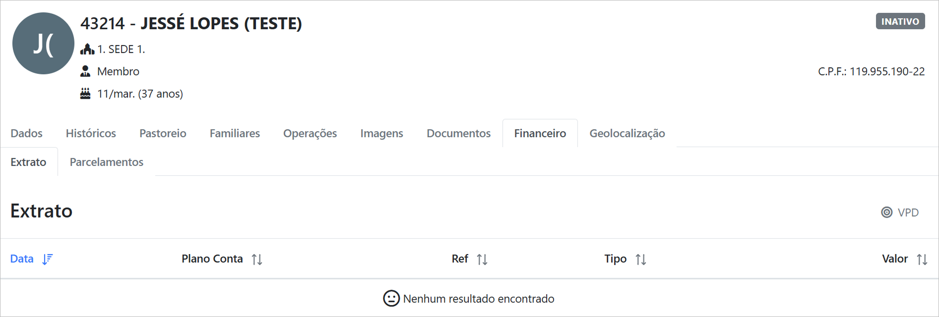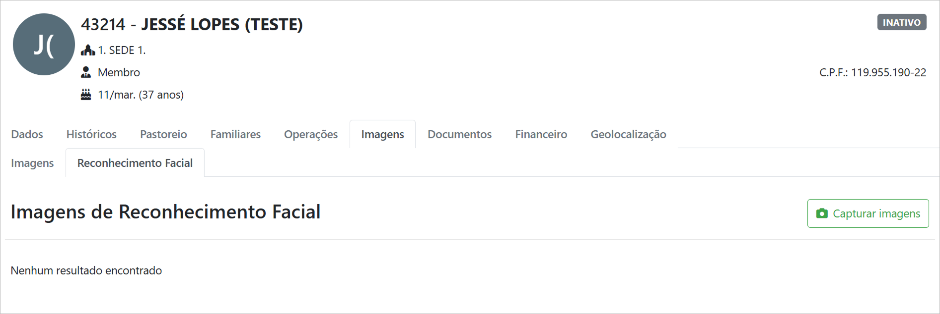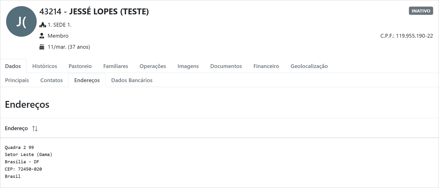 Ao localizar um membro e clicar sobre o nome, será exibida a página de detalhes completos, organizada por seções: