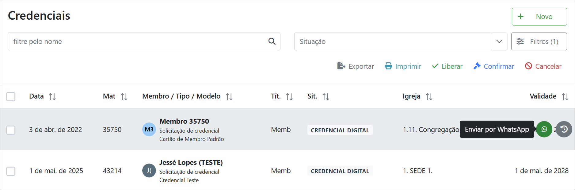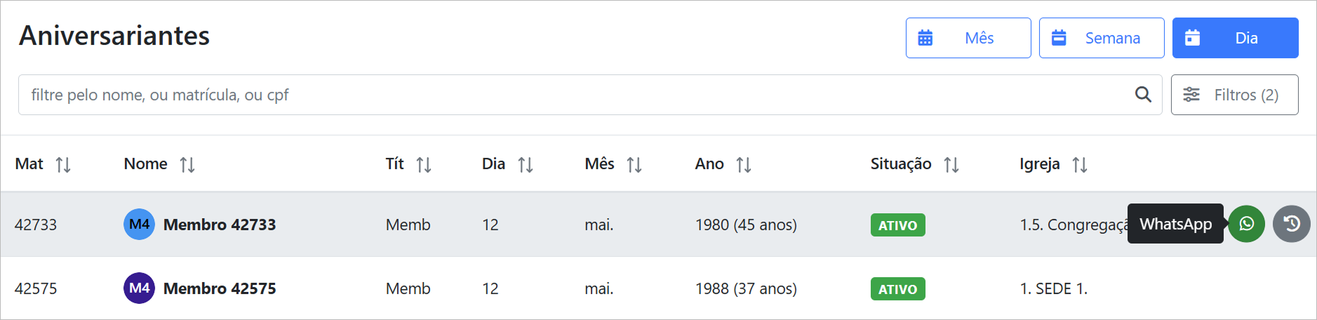 É possível enviar uma mensagem ao aniversariante do dia, passando o mouse sobre o registro do membro, na tabela, e clicando no ícone do "WhatsApp" (canto direito).