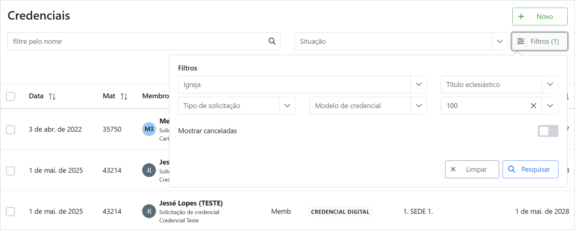 Página destinada à solicitação e gerenciamento de credenciais ministeriais pelos membros.