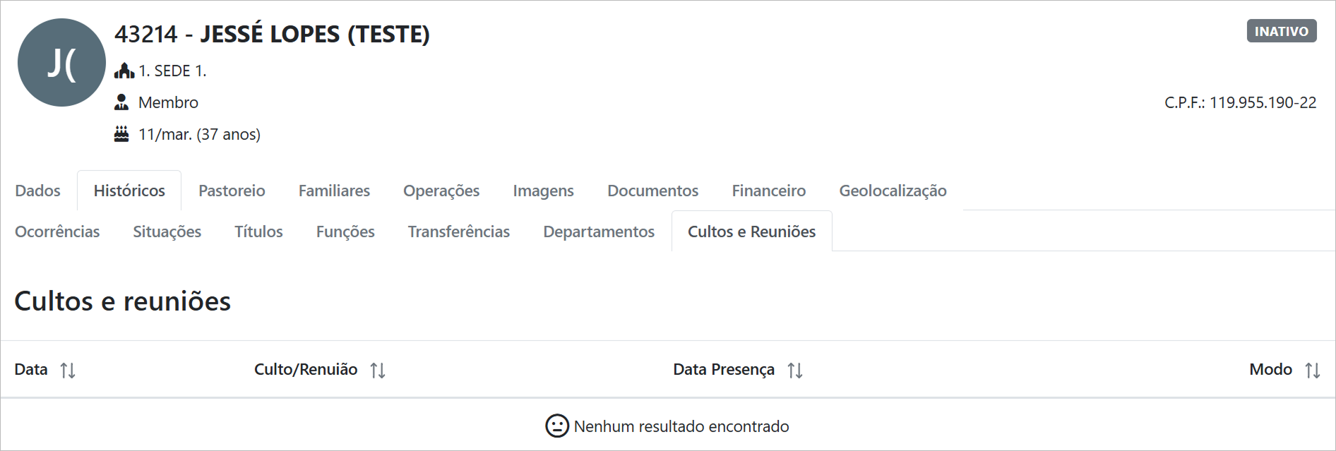 Histórico de participação do membro em cultos e reuniões oficiais, para fins de acompanhamento e engajamento.