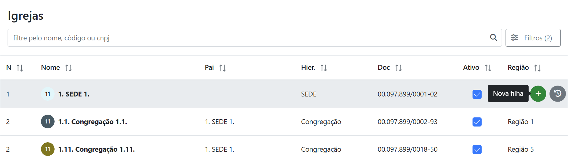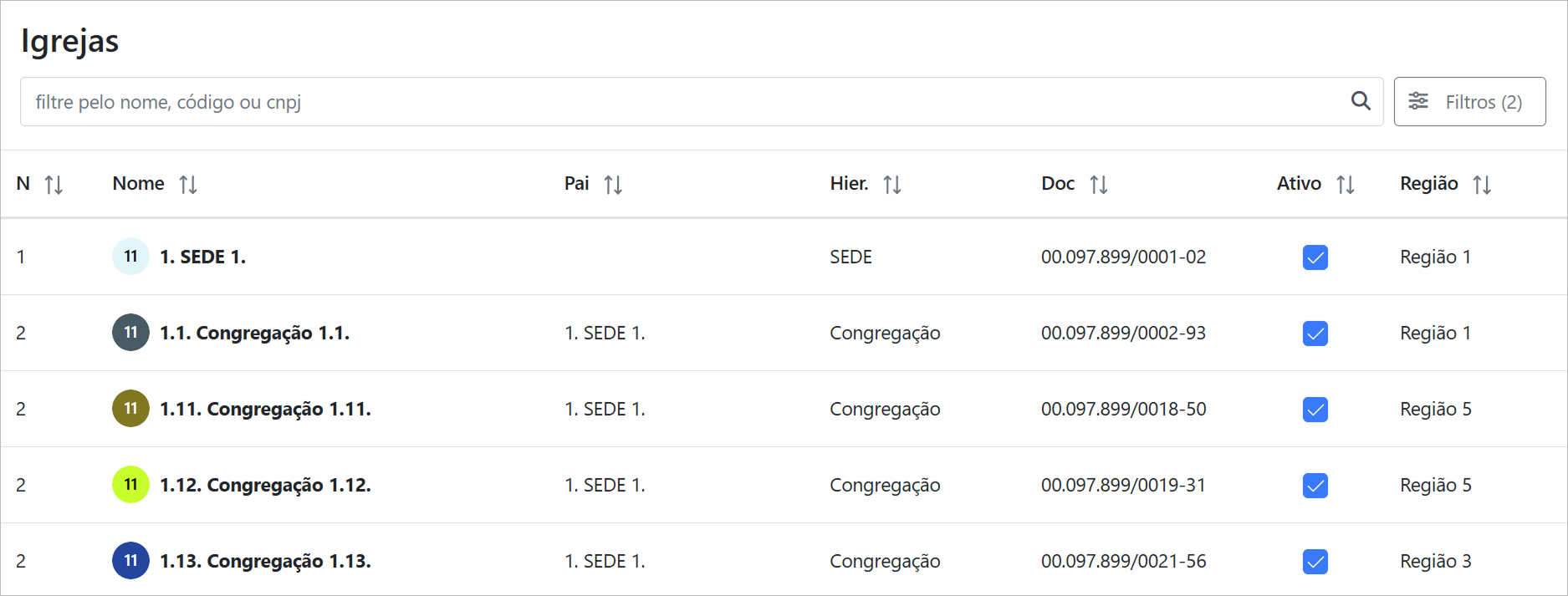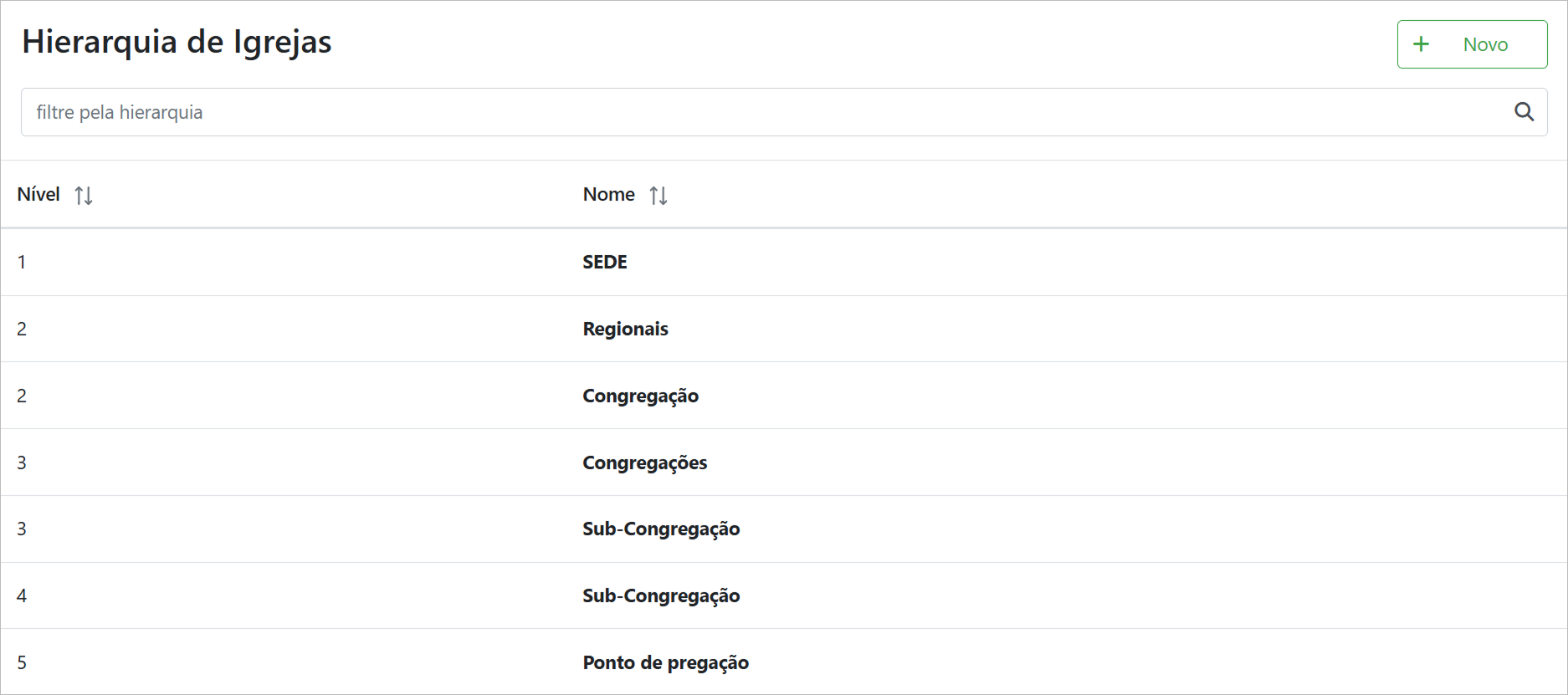 Define a estrutura organizacional das igrejas (ex: Sede > Congregação > Sub-Congregação).