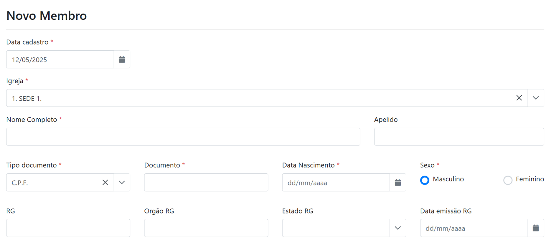 Ao clicar no botão, a seção “Novo Membro” será exibida, com campos detalhados para preenchimento.