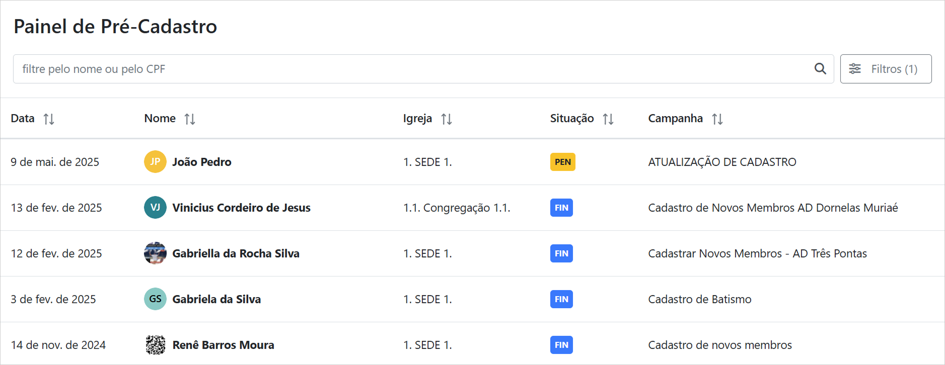 A aba Secretaria concentra as principais funcionalidades administrativas do sistema, oferecendo acesso rápido e organizado a informações essenciais para a gestão eclesiástica. Nela, é possível visualizar e gerenciar dados de membros, aniversariantes, credenciais ministeriais, igrejas vinculadas, além de acompanhar pré-cadastros e transferências entre congregações/igrejas.