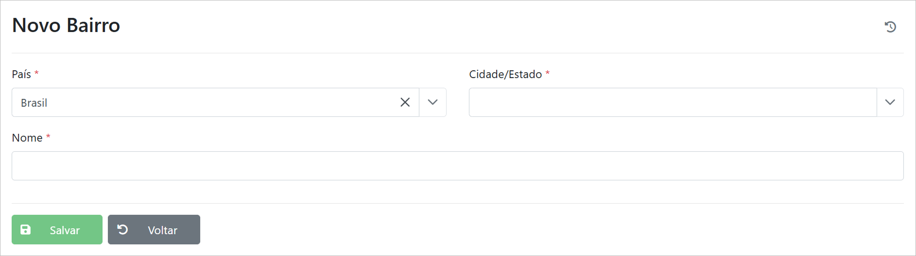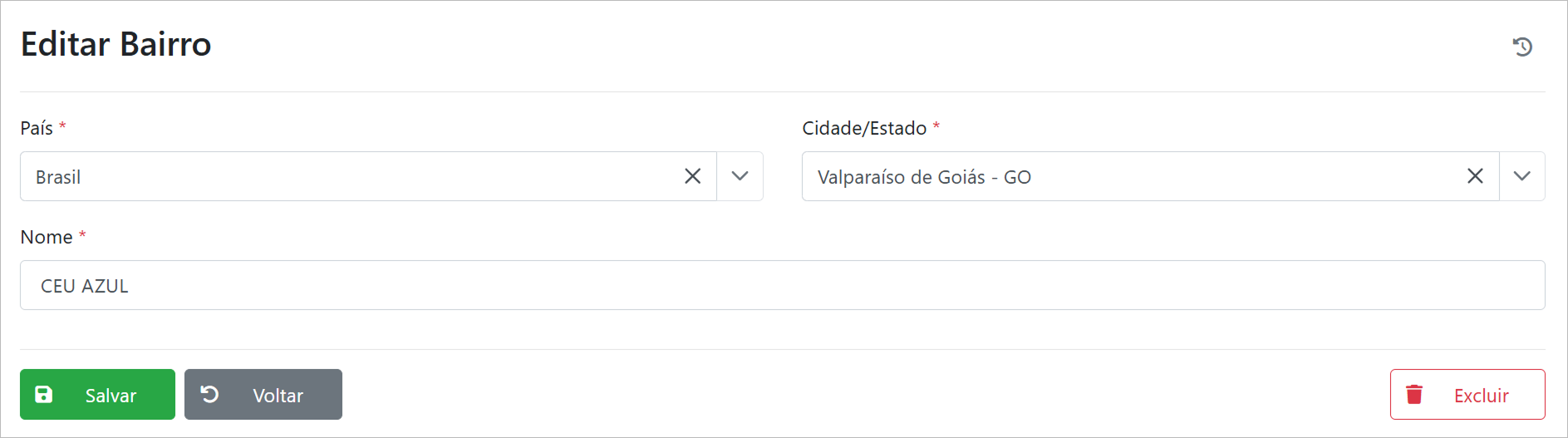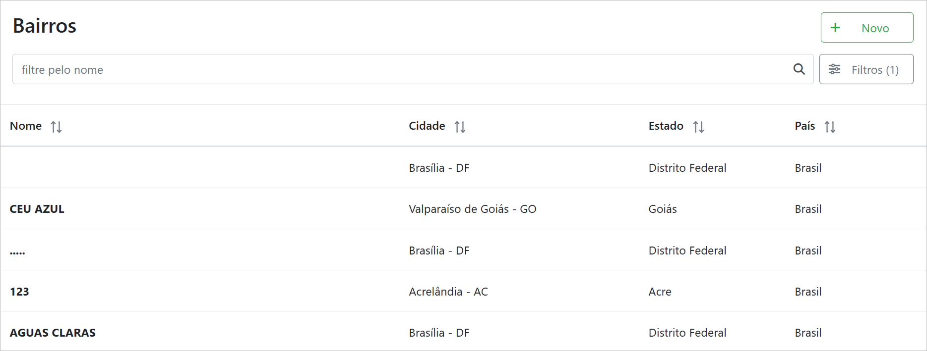 É possível adicionar novos bairros, clicando em "+ Novo".