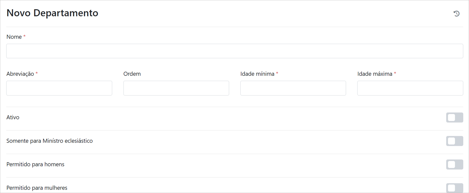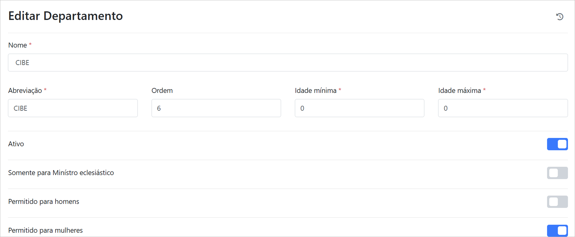 Cadastro de departamentos ministeriais internos da igreja (ex: Infantil, Louvor, Irmãs, Jovens, Ensino, etc).