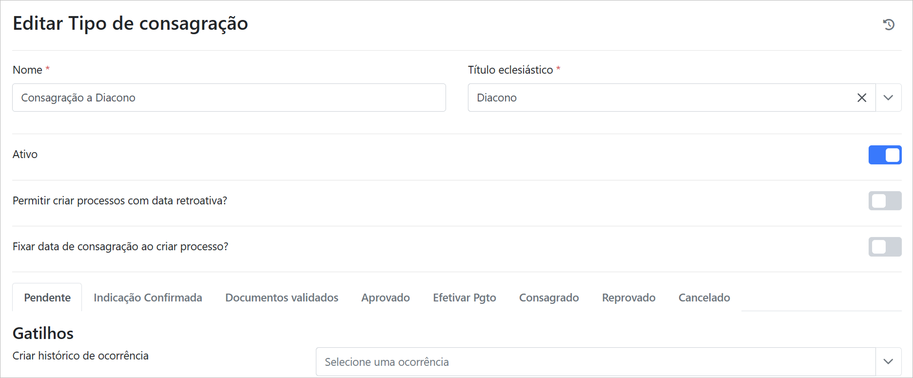 Configuração de tipos de consagração eclesiástica utilizada no processo de consagração (ex: Pastor, Missionário).