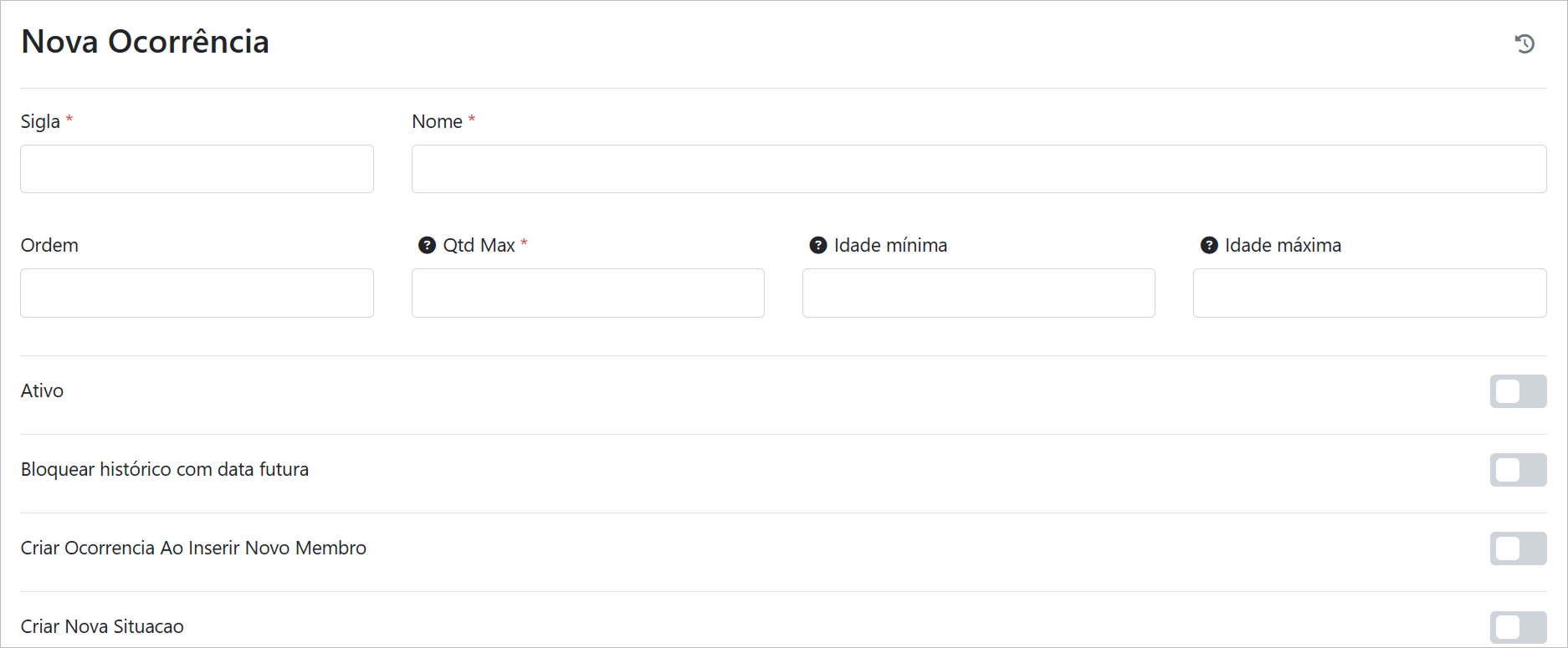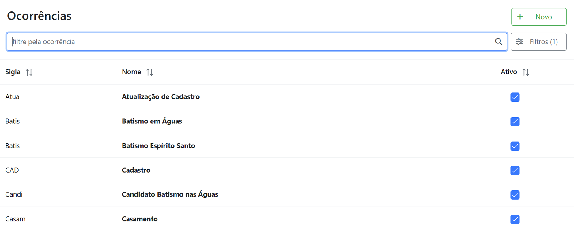 É possível adicionar uma nova ocorrência clicando no botão "+ Novo".